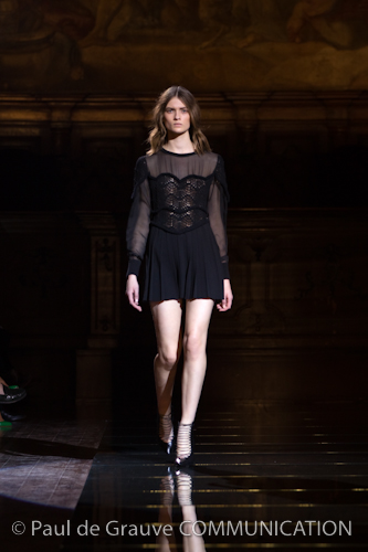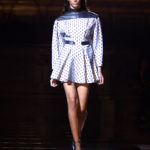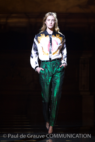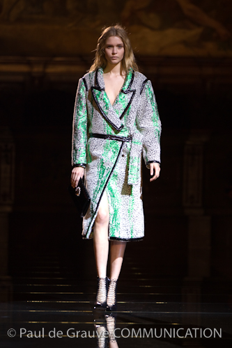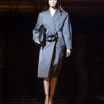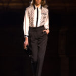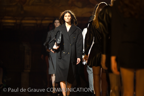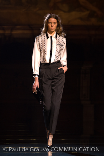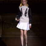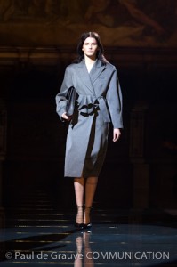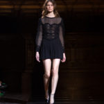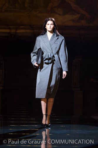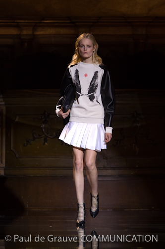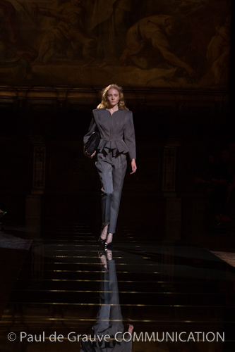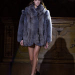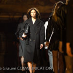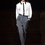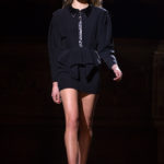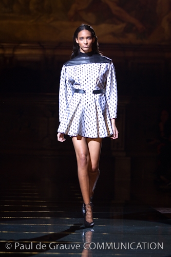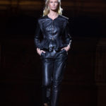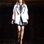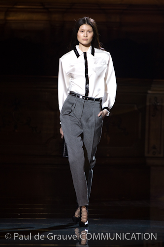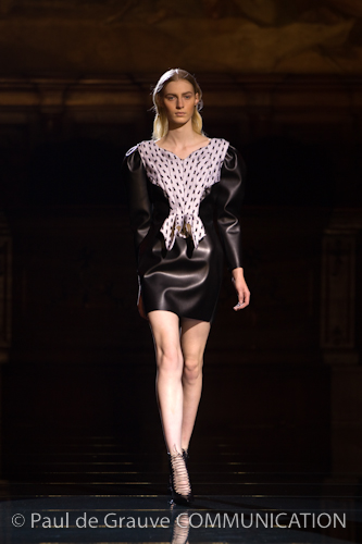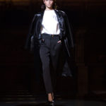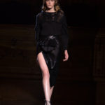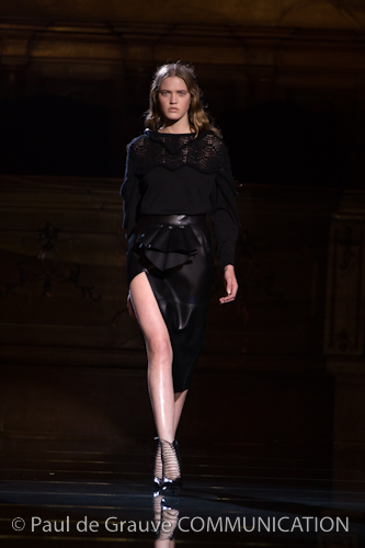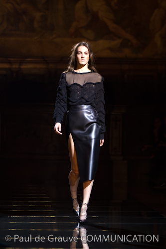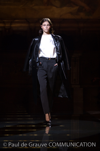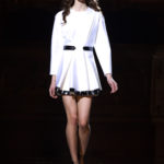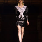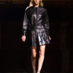 Domina decisamente la pelle o materiali tecnici proposti per le gonne a vita alta anche a pieghe cortissime o lunghe ma con profondi spacchi laterali, copri spalle e tailleur pantalone rigorosamente neri che regalano una atmosfera dark, una immagine femminile sensuale ed aggressiva. Poi le pelli naturali: pellicce cortissime e voluminose. Inserti di pelle e profili neri sui grandi revers di una giacca over bianca creano un gioco di grafismi. Il gioco bianco/nero si ripete in altre uscite, l’abito bianco cortissimo con cintura e bordo nero,camicia immacolata, polsi, collo e sopramontura nera. Sorprendente è il fatto si tratti di profili in anguilla.