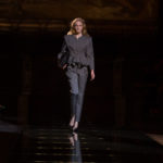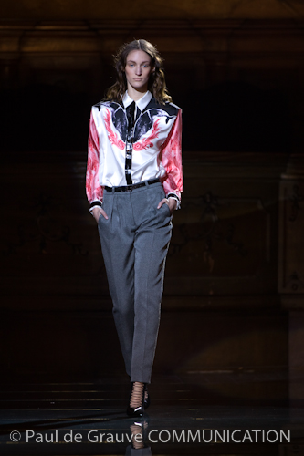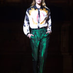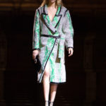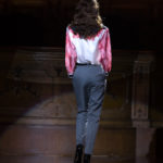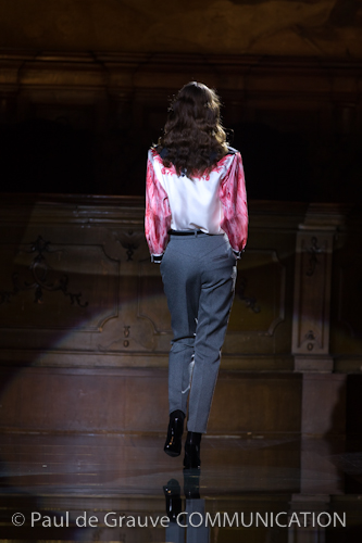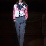 Poi i colori:il grigio in varie sfumature; il verde metallico e il rosa delle stampe surrealiste, il frutto che si apre, delle morbide camicie in twill di seta, nonché il rosa pompelmo dell’abito finale il più sorprendente della collezione.
