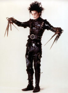 “Edward mani di forbice” (1990, Tim Burton) narra la surreale storia di Edward, robot trasformato in essere umano dal suo geniale inventore, morto però prima di completarlo: per questo motivo, al posto delle mani, ha una serie di forbici. Edward vive rintanato nell’oscuro castello che sovrasta una piccola cittadina americana, finchè Peggy, rappresentante di una ditta di cosmetici, non lo scopre e decide di portarlo a casa con sè per inserirlo nella società umana. Ma Edward, con quelle mani che non gli permettono di toccare un oggetto o di stringere una persona e che anzi incutono timore, non viene ben accolto. I suoi capelli neri lunghi e arruffati, la sua pelle pallida ricoperta dalle cicatrici che si è procurato cercando di toccarsi e la strana corrazza di pelle nera che indossa, la quale lo ricopre interamente, decorata con borchie e cinture spesse non aiutano di certo, e Peggy decide di “normalizzarlo”, almeno dal punto di vista dell’abbigliamento: non senza qualche fatica, riesce a renderlo un pò più presentabile infilandogli una camicia bianca e un paio di pantaloni neri sopra la sua corazza. Nonostante le apparenze ostili, in netto contrasto con gli abitanti della cittadina, che si vestono di colori sgargianti e vivono in villette delle stesse tonalità, Edward è buono, tenero e gentile: l’unica cosa che vuole fare è aiutare gli altri, soprattutto i suoi cari. Pian piano, Edward reisce a conquistare tutti gli abitanti, prima come giardiniere, poi come parrucchiere per cani e infine per donne, trasformando i cespugli in creature fantastiche e i capelli delle signore in acconciature asimmetriche e stravaganti. Si innamora subito di Kim, la figlia di Peggy, ma una serie di circostanze mutano l’opinione che la gente ha di lui, che comincia a vederlo come un mostro pericoloso. Alla fine, Edward è costretto a smettere gli abiti “normali” e ad abbandonare Kim per ritornare a vivere nel castello, isolato da tutti come prima: il suo abbigliamento comune, che finora gli ha fatto da rifugio protettivo, non lo protegge più, non lo fa più sentire simile agli altri. Viene da chiedersi se siano gli abitanti della cittadina a doversi vestire di nero e se sia invece Edward a dover indossare i colori allegri e accesi che questi sfoggiano. Ma Edward indosserà per sempre la sua corazza nera, dopo aver forse capito che la sua diversità non è un male, anche se non gli permette di vivere in mezzo ad altre persone.