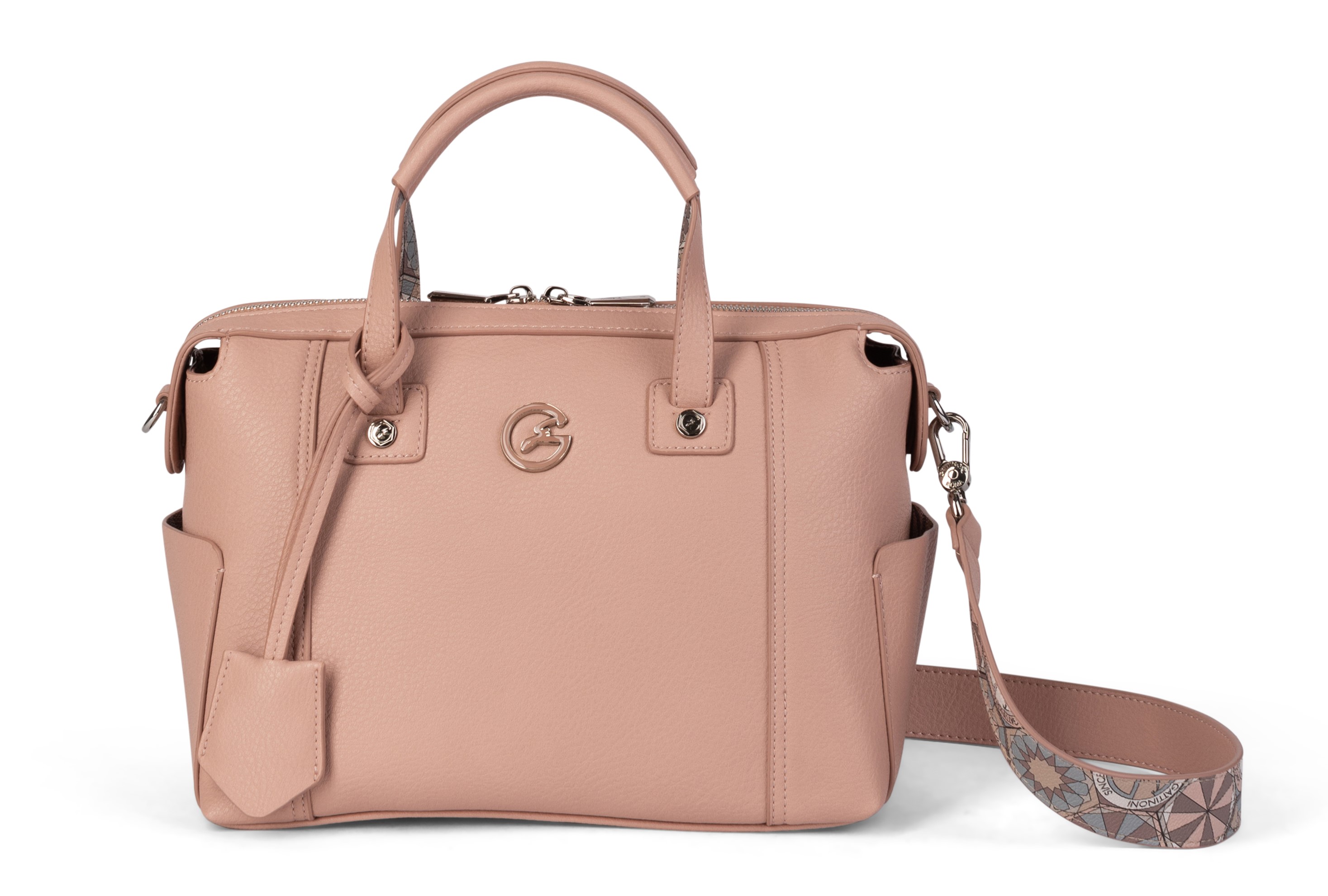 Le proposte sono intriganti e si distinguono in tantissime declinazioni: dalle comodissime shopping alle flap, dagli zainetti alle hobo, dalle sfiziosissime crossbody alle bowling. Si possono portare a mano oppure a spalla grazie alla tracolla staccabile arricchita dall’iconica stampa Teodosia ispirata ai mosaici bizantini ravennati che aggiunge un tocco caratteristico ed identificativo della linea Gattinoni Roma.