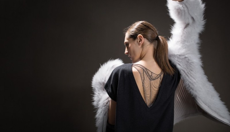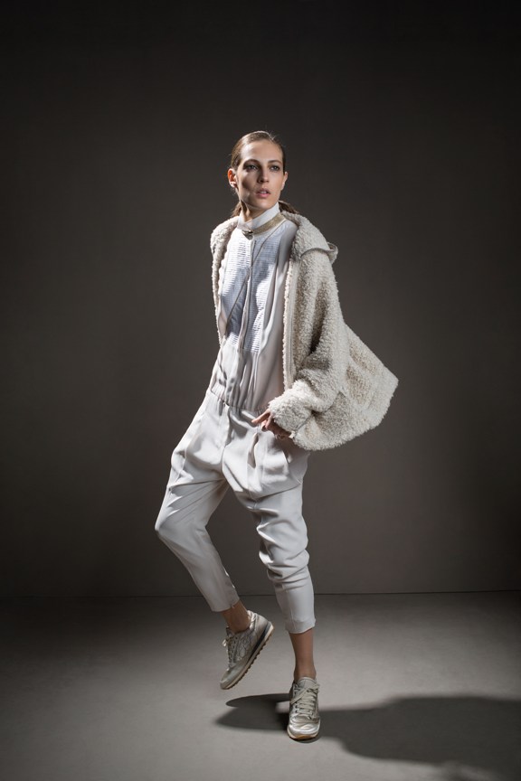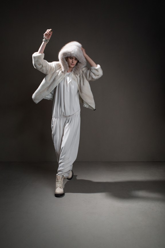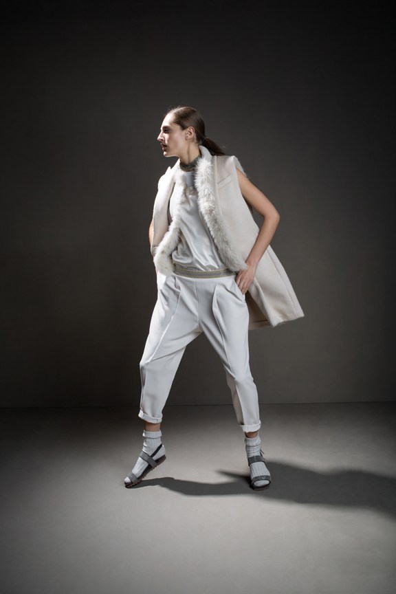 La bellezza -che ferma lo sguardo e toglie il fiato- del bianco totale, delle montagne innevate, dell’acqua che scorre sui sassi, dell’avorio di certi monili preziosi, delle sabbie di certi indimenticabili deserti, della divisa degli ufficiali (gentiluomini) di marina che, come un vecchio romantico film ogni tanto ci riporta alla memoria, salvano se stessi affidandosi all’amore, vero motore che, secondo noi, sta alla base delle “creature” di Brunello, stilista filosofo immensamente innamorato di quel che porta avanti con sempre fresca propensione.