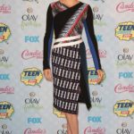 Invece qualche mese dopo, ai Teen Choice Awards, portava un vestito di Peter Pilotto della collezione autunno/inverno 2014-15, composto da maniche lunghe aderenti, nere davanti e blu ceruleo dietro; corpetto anch’esso aderente con uno stretto scollo a V attraversato da tagli diagonali, che permettono l’alternanza del tessuto nero con una stampa multicolore astratta fino alla vita, circondata da due fasce bianche leggermente in oblique; gonna dritta, anch’essa divisa in tre pannelli, però verticali, dal più ampio in un tessuto di lana simile a chanel in bianco, nero e rosa mountbatten, qui si apre un piccolo spacco, a cui segue in pannello più piccolo, di colore nero, a cui ne segue un altro in cobalto. Per dare il tocco finale ad un look così ardito sono bastate le semplici decollettes rosse “Britton” di Kurt Geiger.