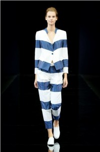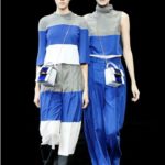 “Il colore in determinati posti ha il grande pregio di far sembrare più energici i profili e i piani strutturali”. Questa frase di Antonì Gaudì fa comprendere il risultato che assumono i vari capi della collezione nel gioco delle righe maxi o sottili -in alternanza di blu e bianco/ grigio-, in una dinamica di forme geometriche piane o solide –tridimensionali-; nei volumi degli abiti. Tutto ciò regala una silhouette femminile decisa e allo stesso tempo leggera e in movimento. Grazie ai profili bianchi o blu le giacche dalle diverse tonalità di blu,si arricchiscono di incisività, precisione e forza, mantenendo una femminilità leggera e dinamica, moderna.