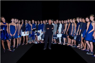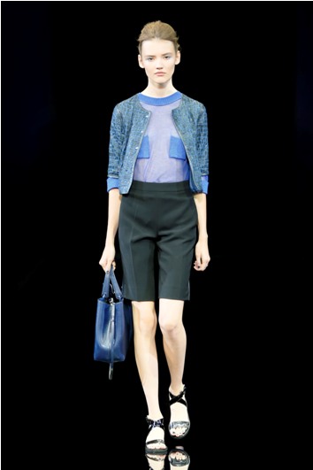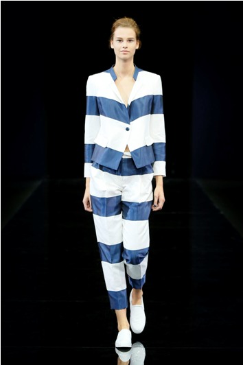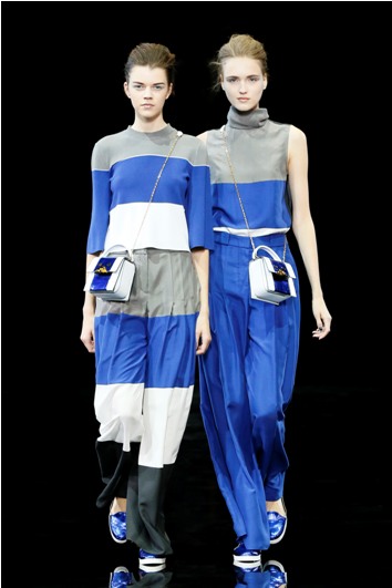 Una collezione, quella P/E 2015 di Emporio Armani, sportswear dinamica e giovane che diventa uno scrigno di eleganza e di bellezza grazie alla capacità di Giorgio Armani di giocare sulla combinazione delle tante sfumature che possono assumere due soli colori bianco –che talora sfuma nel grigio- e blu.
