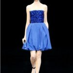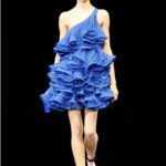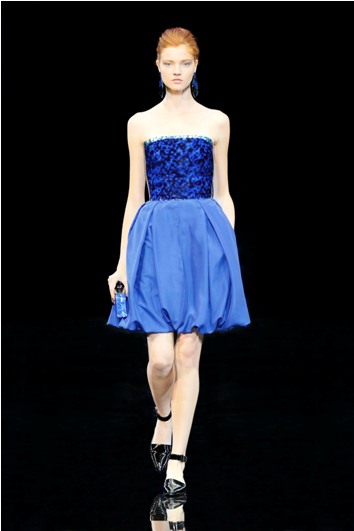 Non solo. Lo stilista sa sfruttare anche le particolari intensità che possono assumere i colori, nel nostro caso il blu, in tessuti diversi. Non è lo stesso risultato quello che può ottenere quando i colori sono assorbiti dal cotone carta o dal PVC semitrasparente delle sottovesti che si intravedono sotto le gonne, o se diventa intenso e luminoso, lucido nell’ outift gonna e top, scarpe e borsa tutte dello stesso materiale o se si smorza sul tessuto della gonna palloncino con il corpino stampato blu e profilato nella stessa stampa ma di un celeste un po’ slavato.