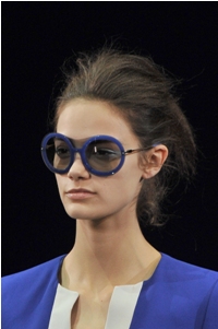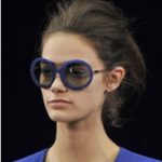 Blu anche gli accessori, scarpe, sandali, borse e maxi pochette, piccole borse a tracolla, un cubo bianco e blu, in PVC ed grandi occhiali rotondi sempre blu.
