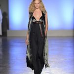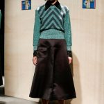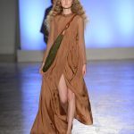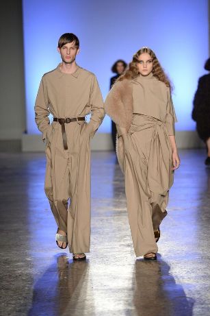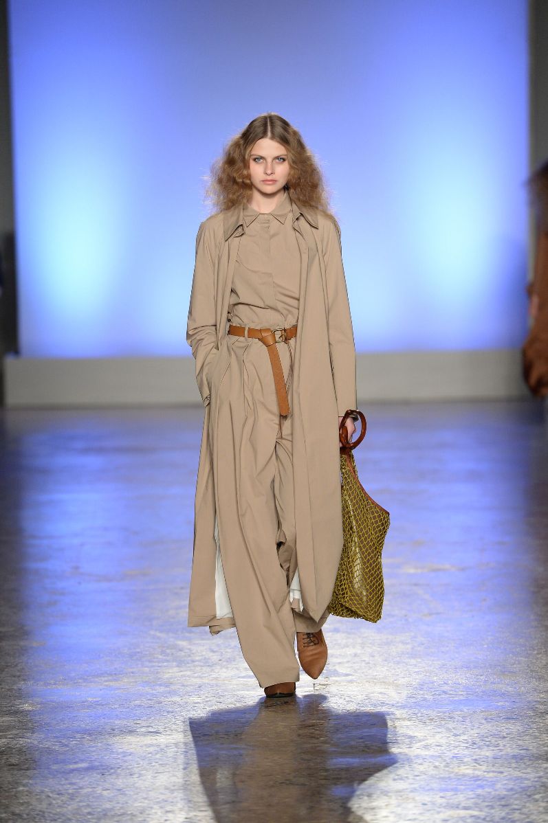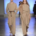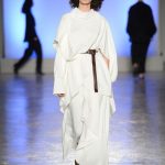 Innesti di passato si insinuano nel presente con tuniche che citano il monachesimo, mise che ricordano la semplicità degli indumenti agresti come i pantaloni maschili e larghi, strizzati in vita color cioccolato ed altre che rievocano i pepli dell’antica Grecia, come nel caso della camicia bianca dal manto impalpabile e fluttuante lasciato libero di giocare con il vento. Giochi di volant asimmetrici e sovrapposti per alcune gonne si alternano a giacche costruite che si stringono e si allargano sul corpo appoggiandosi rilassate sulla silhouette. Tutte le mise hanno un comune denominatore, fatto di sofisticata eleganza e ricercatezza.