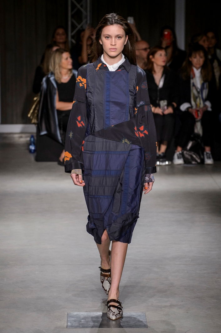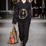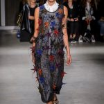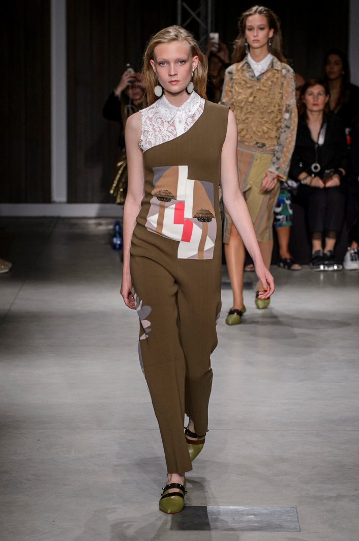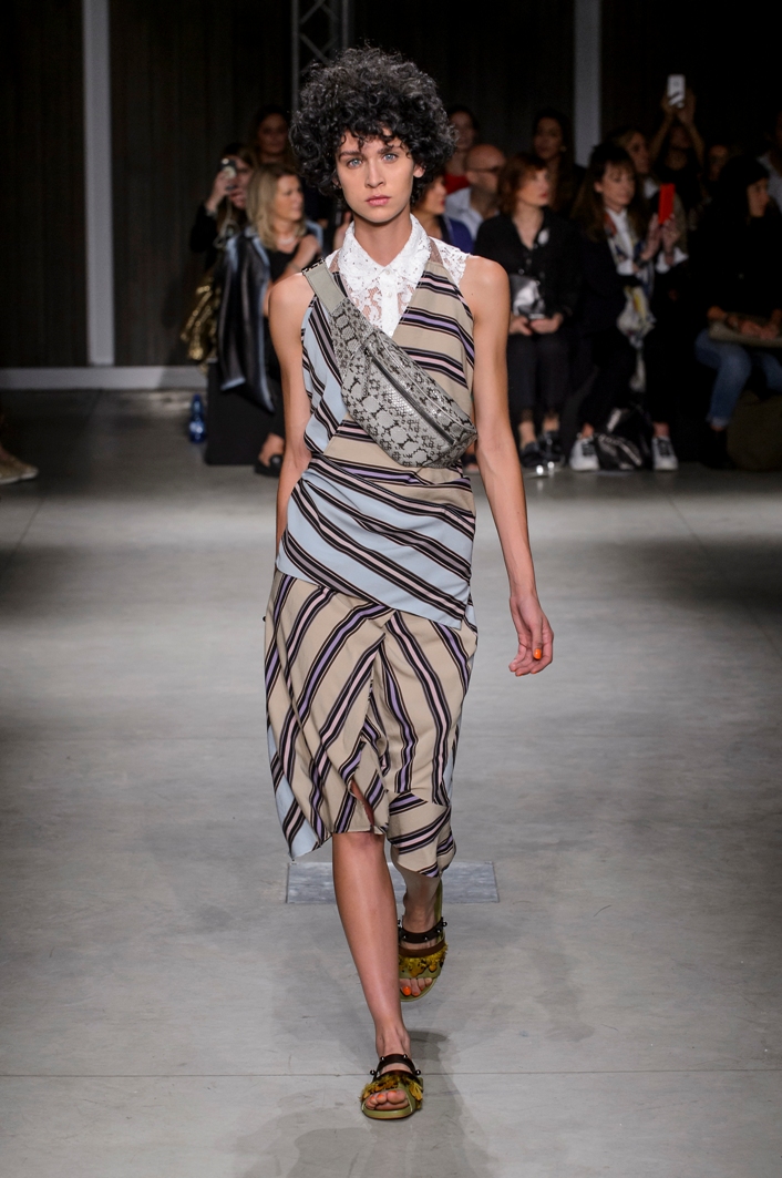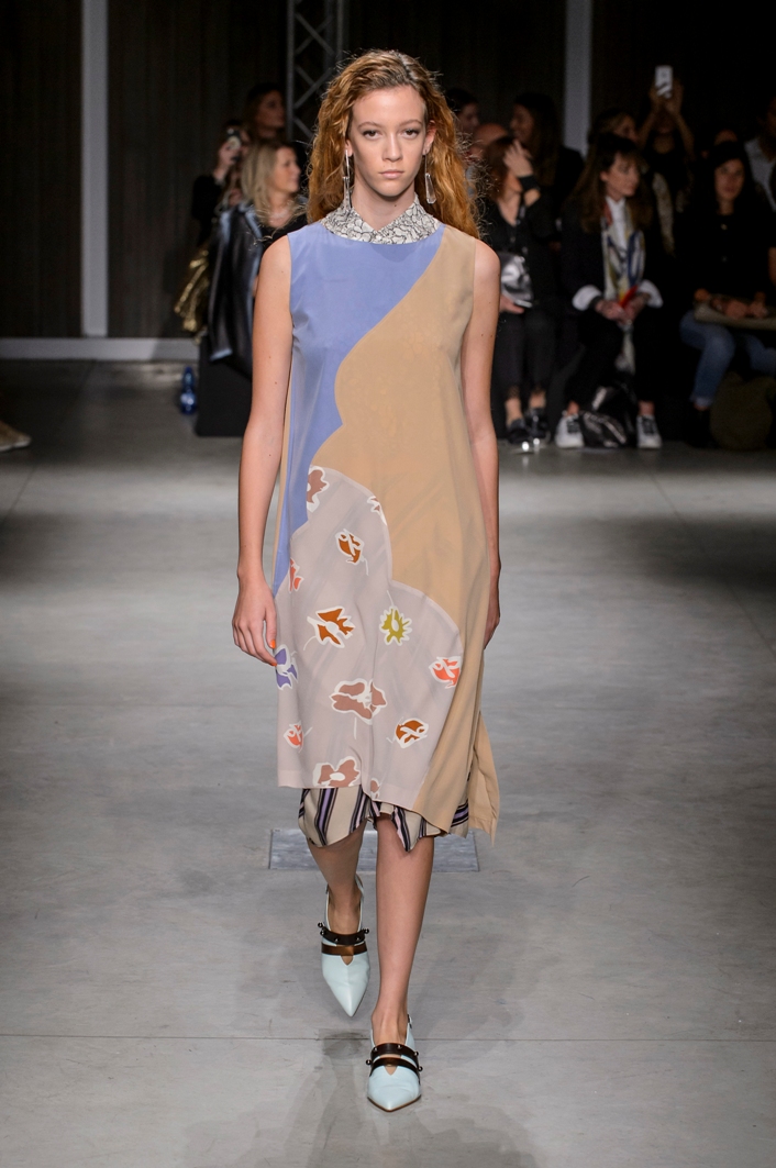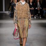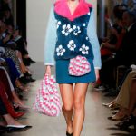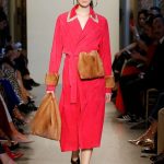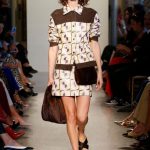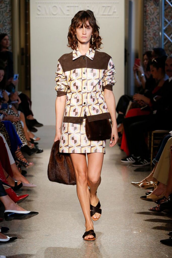 Generoso altresì, l’impiego della pelle stampata; con motivi animalier per trench di gusto francese, a motivi geometrici in toni pastello, che ricordano le carte da parati anni 60’, per minigonne e giacche zippate.
