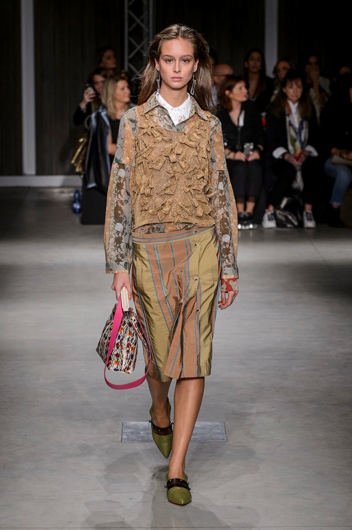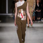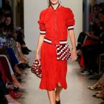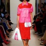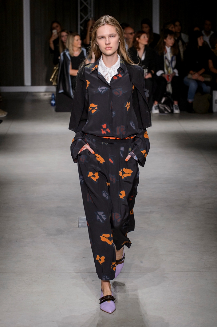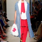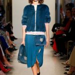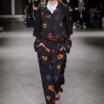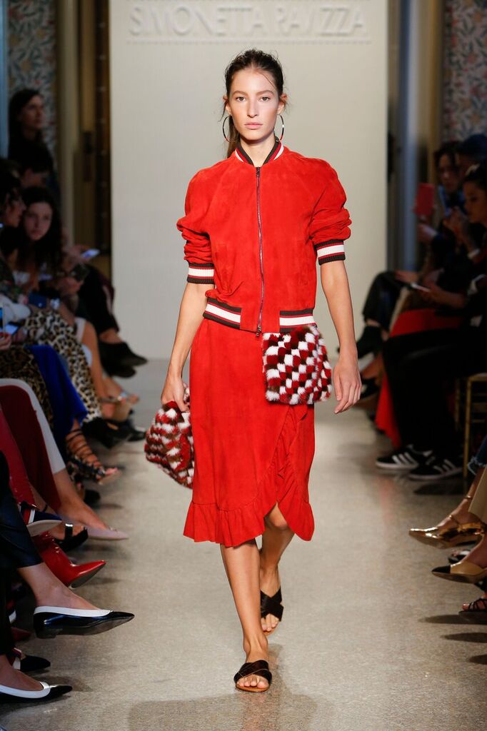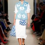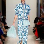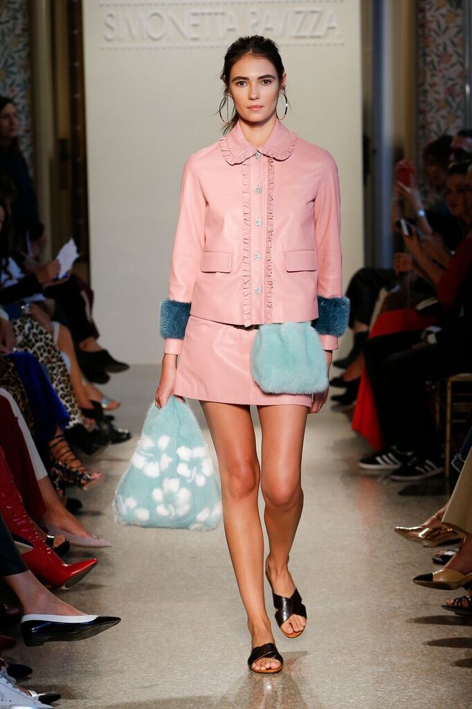 Le gonne hanno lunghezze varie, dalla irriverente mini in pelle colorata proposta con su la classica trucker racket; a lunghezze midi, dalle forme affusolate e rassicuranti come le gonne portafoglio con bordature di volant. I pantaloni, in morbido camoscio sono proposti con su vestaglie iperfemminili dello stesso materiale e dall’ampiezza generosa.