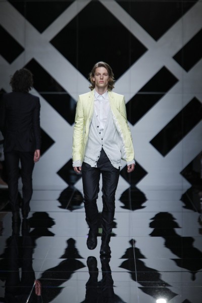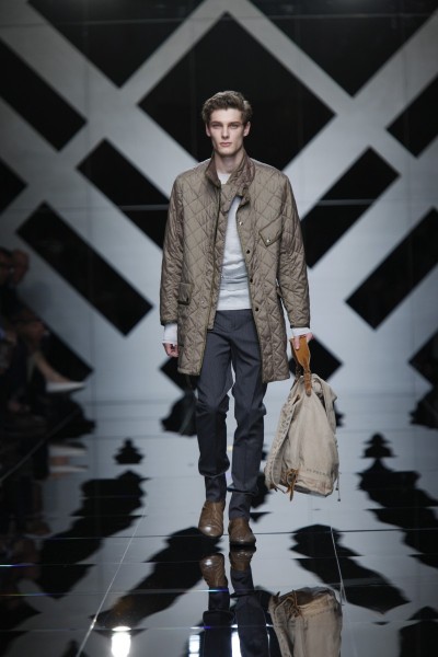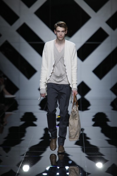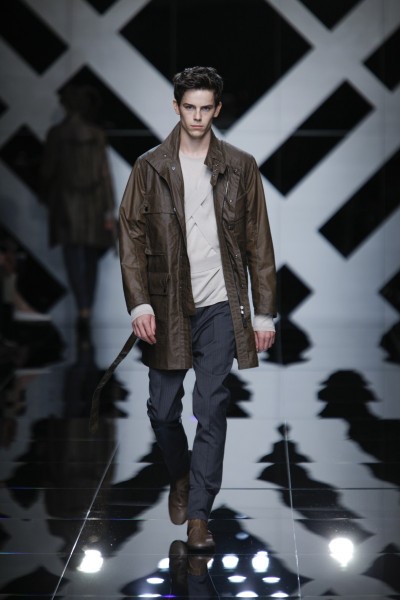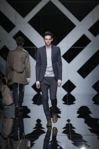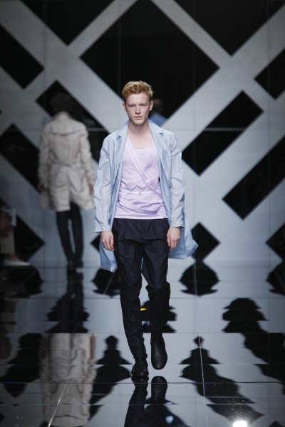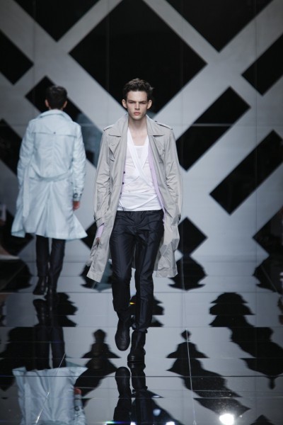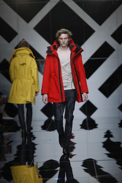 Christopher Bailey è bravo e il successo di Burberry va accreditato anche a lui che per la p/e uomo 2010 addolcisce i capi tradizionali, e gioca con materiali, colori e dettagli. Il trench è presentato anche in versione trapuntata, e in tessuti leggerissimi, nylon e seta o in versione più pesante: impermeabile di cotone, incerata di lino, incerata in tela di cotone, fino ad arrivare agli impermeabili pesanti con doppio colletto e doppio revers, o con cappuccio con visiera incorporata. Bailey gioca con i colori che spaziano dai toni più scuri, neri e antracite, marrone ardesia per passare ai grigi dal piombo al gesso, poi intaco e verde bottigli rosso uniforme, ultramarino, giallo da incerata.