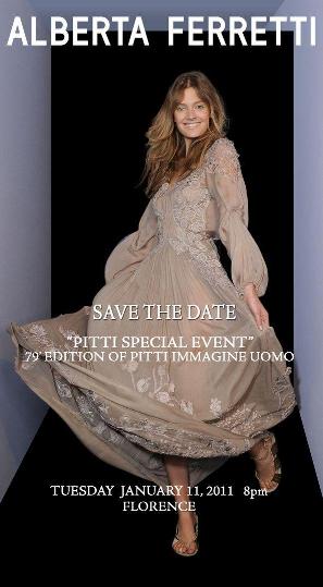 Alberta Ferretti a Firenze alla 79° edizione di Pitti Immagine Uomo a gennaio 2011. Martedì 11 gennaio alle ore 20.00 la griffe sarà protagonista dello “special event”, una sua sfilata creata ad hoc per la manifestazione.