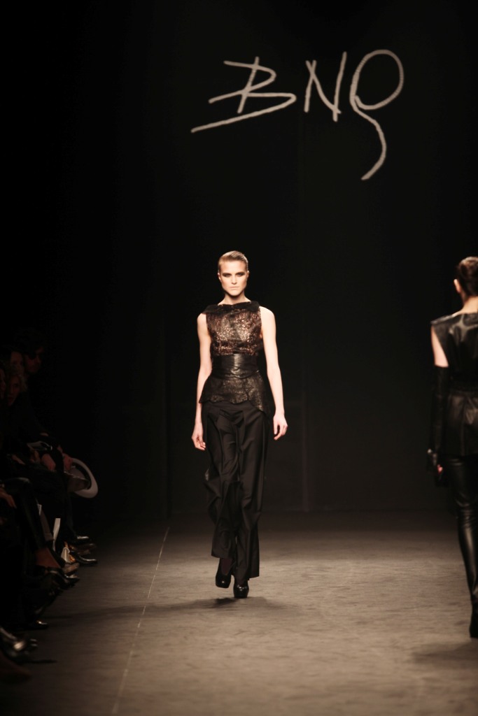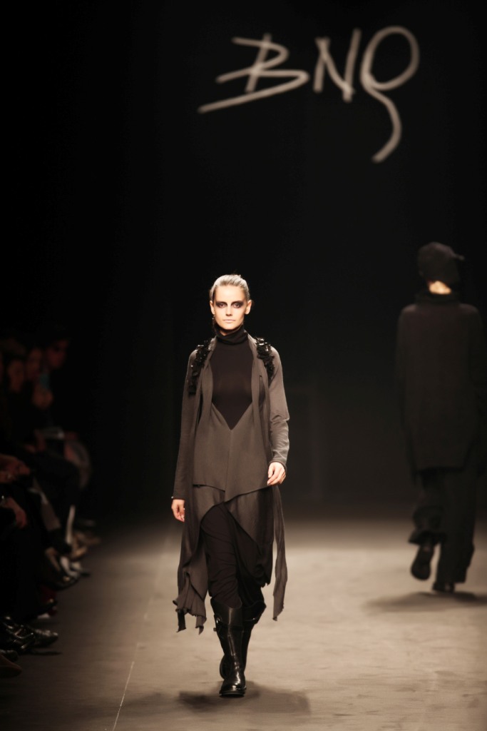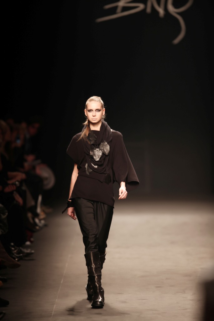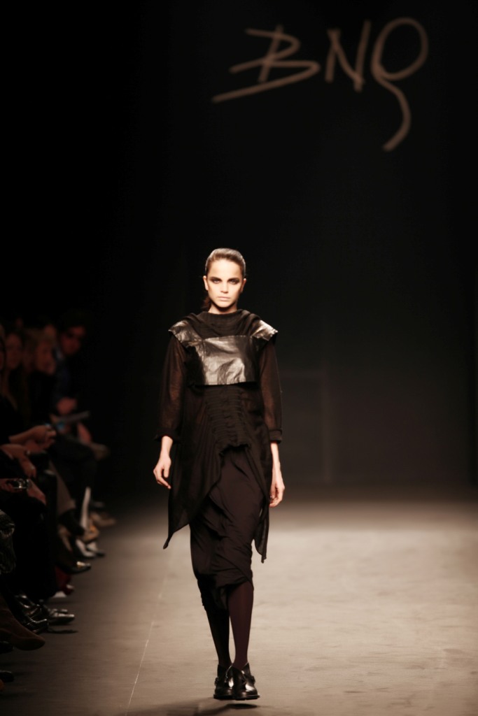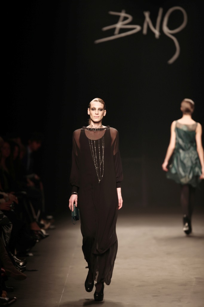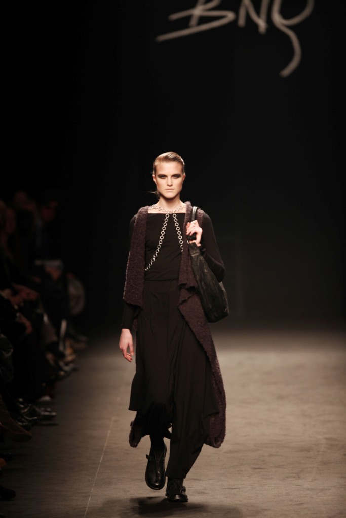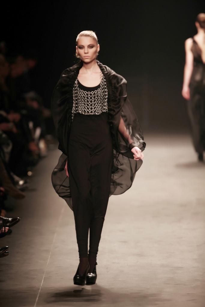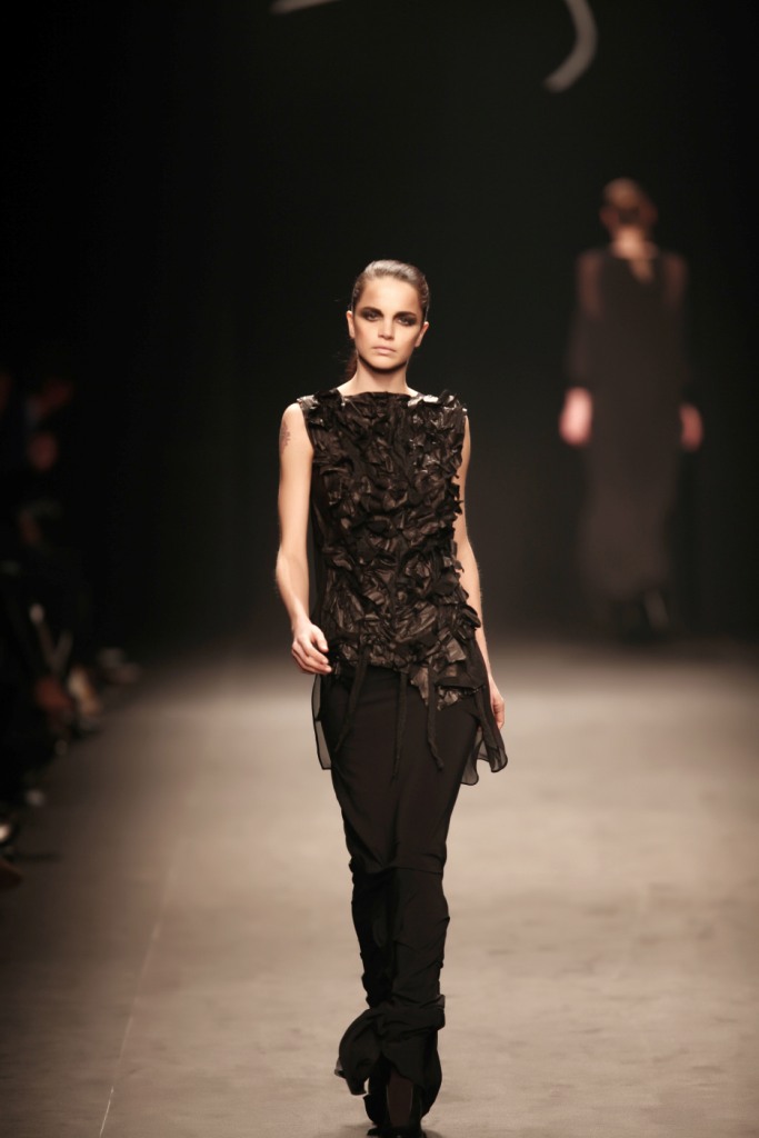 Sul sottofondo di una musica sempre ritmata, le modelle avanzano a passo veloce e deciso: la figura femminile da cui Nilgün trae ispirazione è la guerriera Clorinda, da cui la donna di oggi eredita il coraggio, la caparbietà e la sicurezza. Altra traccia di questo mito la ritroviamo nell’utilizzo di catene leggere che prendono la forma di collane o arricchiscono semplici abiti neri, arrivando a costituire dei veri e propri gilet o copri spalla.