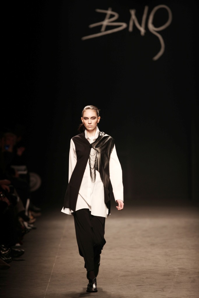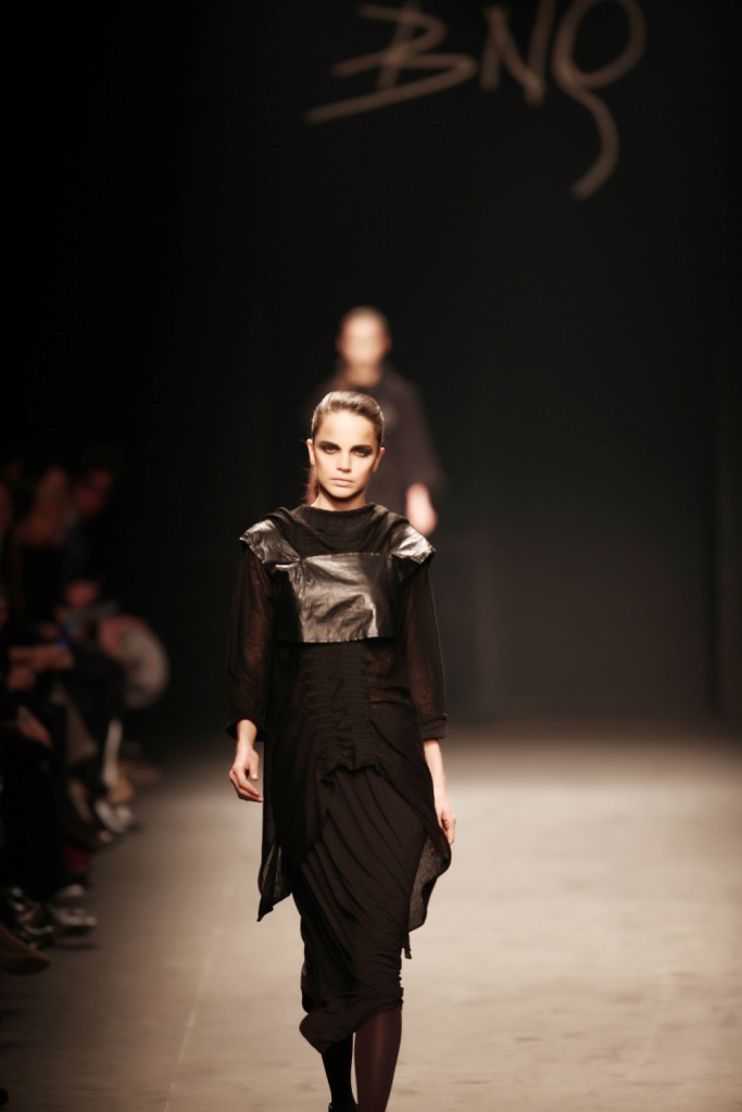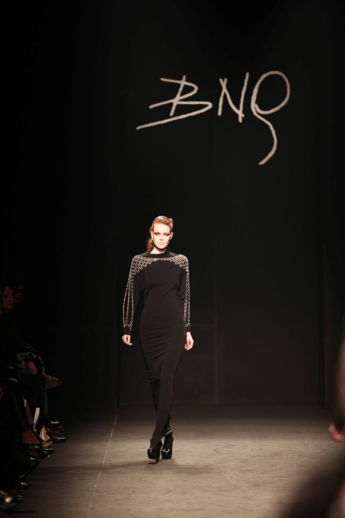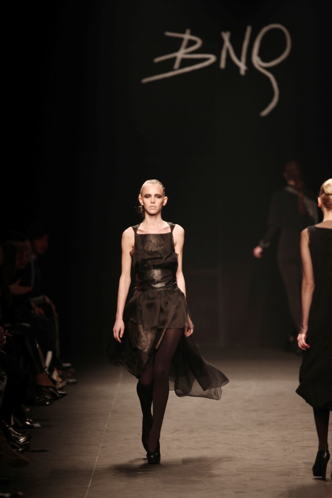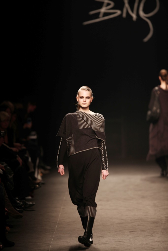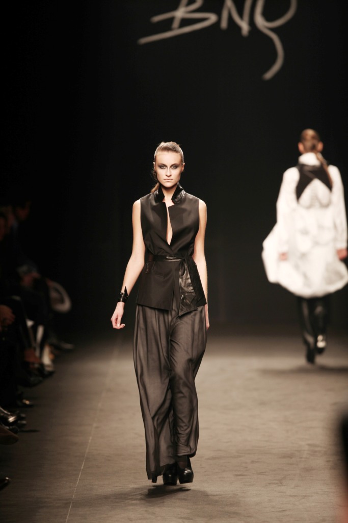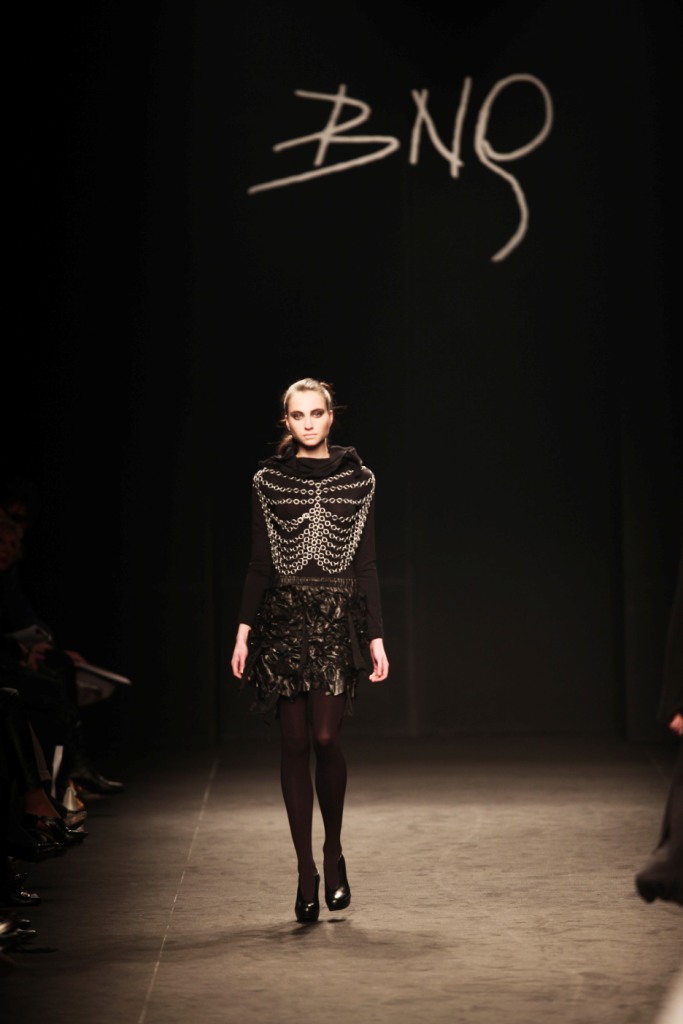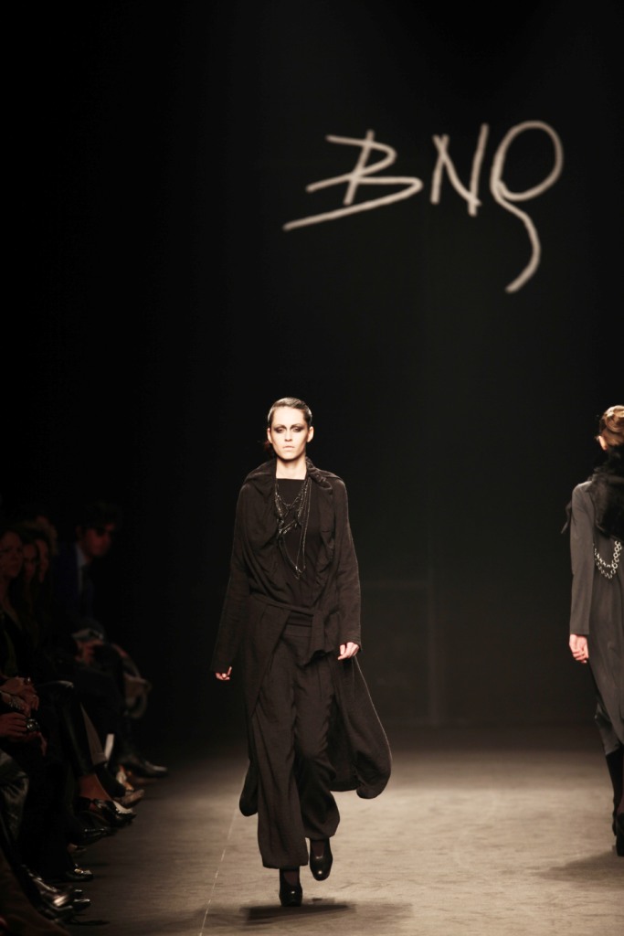 Sul sottofondo di una musica sempre ritmata, le modelle avanzano a passo veloce e deciso: la figura femminile da cui Nilgün trae ispirazione è la guerriera Clorinda, da cui la donna di oggi eredita il coraggio, la caparbietà e la sicurezza. Altra traccia di questo mito la ritroviamo nell’utilizzo di catene leggere che prendono la forma di collane o arricchiscono semplici abiti neri, arrivando a costituire dei veri e propri gilet o copri spalla.