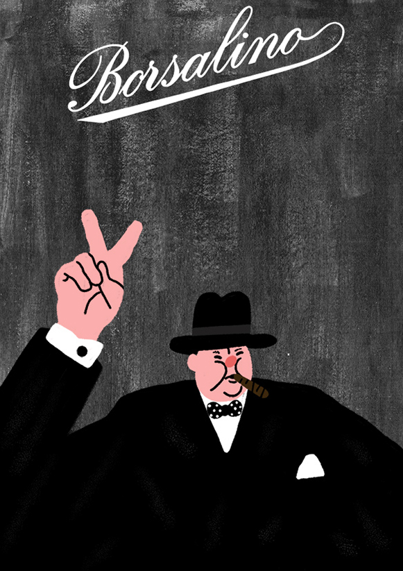 La “mobilitazione artistica”, che è stata aperta da Mario Bortolato, il famoso ‘Bort’ de “La Settimana Enigmistica”, autore di tre tavole ad hoc, vanta tra l’altro i contributi grafici del veneziano Lucio Schiavon, che su input del collega Riccardo Guasco ha deciso di aderire alla rassegna inserendo quattro copricapi nel suo disegno. Pia Taccone e Andrea Musso hanno pensato invece di raffigurare Umberto Eco con Borsalino in testa, mentre il torinese Luigi Leuce ha voluto partecipare all’evento con uno dei suoi classici personaggi traboccanti di allegria. La mostra annovera poi i disegni di un’altra piemontese doc, Chiara Morra (che ha accompagnato la sua adesione con le parole: “Borsalino è un cappello divenuto icona e più volte illuminato dai fari del cinema, oggi tocca a noi puntare una luce sull’azienda”), di Elisa Schiavina da Pavia, Matteo Franco e Paul Mellidi da Roma, il quale ha proposto un elegante bianco e nero con un richiamo al “Piccolo Principe” di Saint-Exupéry. Invece il milanese Francesco Poroli ha presentato una coppia super-chic con cappello in testa, e il vicentino Ale Giorgini un modello “ermetico” nella sua essenzialità, mentre Beppe Beppetti (il vignettista di “Edicola Fiore”) ha esposto un mondo che fa il galante con la luna togliendosi il cappello; d’altro canto l’illustratrice padovana Elisabetta Benfatto ha abbozzato una donna sovrappensiero (“Perché sotto ci stanno delle belle teste: #saveBorsalino”) e la pugliese Paola Lomuscio si è espressa con una matita appoggiata in testa a un uomo elegante.