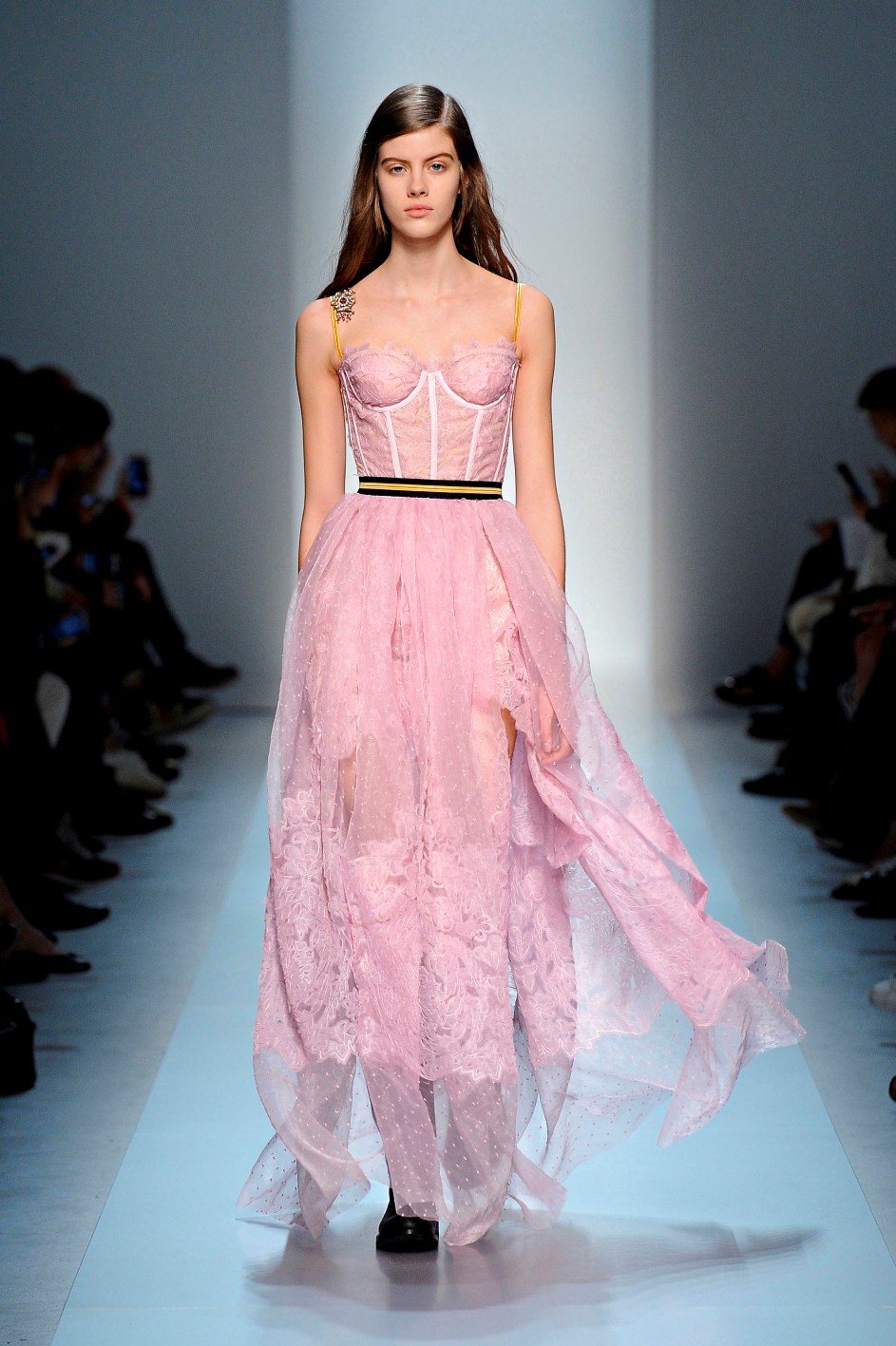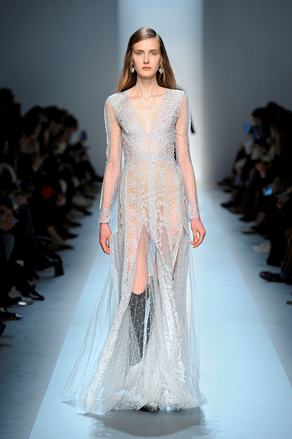Terzo abito. Indossato Nicoletta Romanoff in occasione del Franca Sozzani Award, premio, istituito per celebrare la figura del direttore di Vogue Italia scomparsa e dedicato al talento e al coraggio. Si tratta di un abito lungo trasparente, color rosso fuoco con profonda scollatura a V, un patchwork di pizzi con applicazione di pannelli in tulle plissé. L’abito acquista personalità grazie al colore deciso rosso fuoco rispetto alla pallida nuance dell’aoutfit da passerella e all’aver eliminato i rozzi e alti stivali sostituiti da sandali argento con plateau.