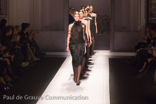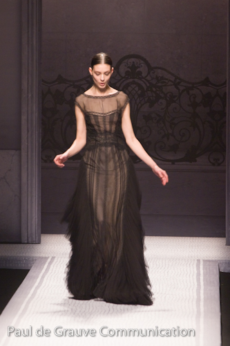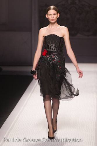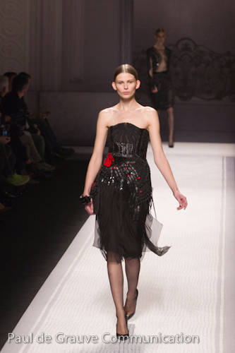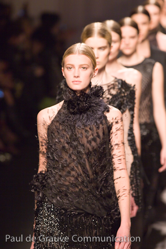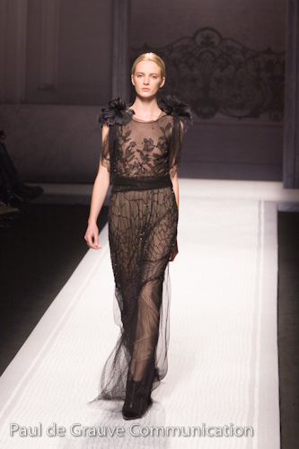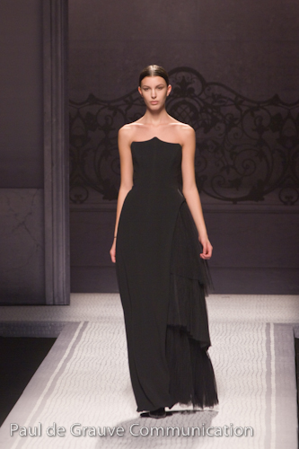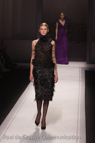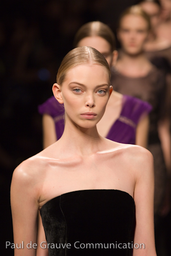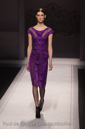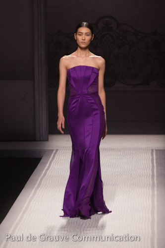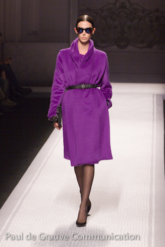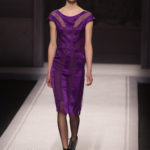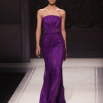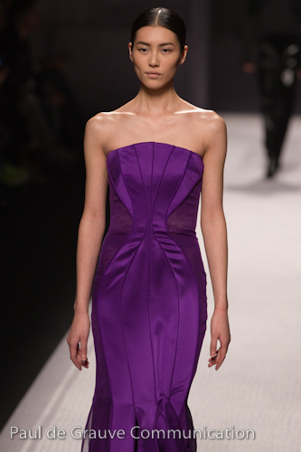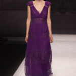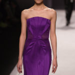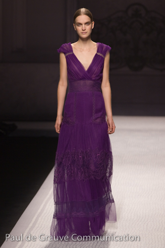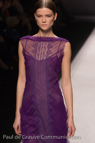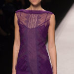 Ciò che più ha sorpreso nella collezione è stata la paletta dei colori poco usuale nella stilista: prevale il nero; ma c’è il viola , il bianco, il verde, il rosso. Viola gli abiti da sera di stile più tipicamente Alberta Ferretti, in chiffon con intrecci o con intarsi di pizzo leggerissimo.