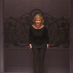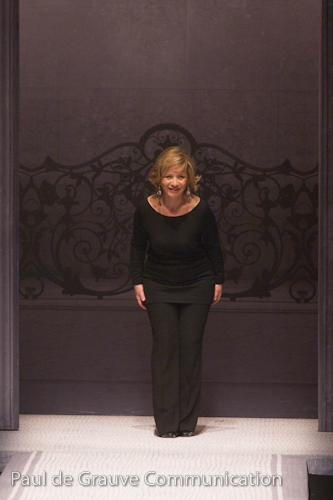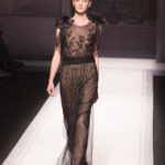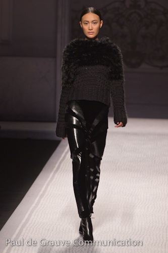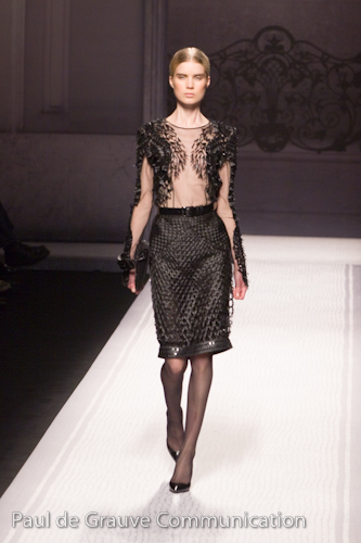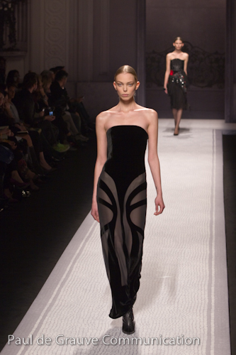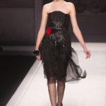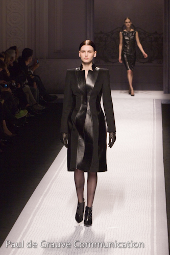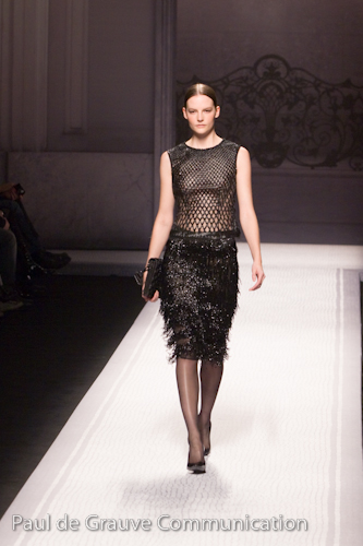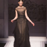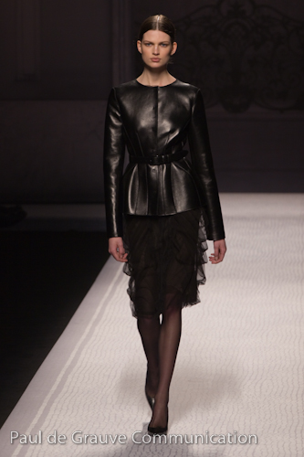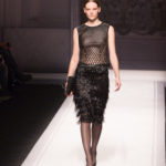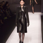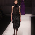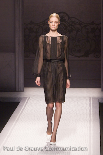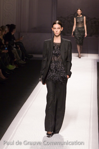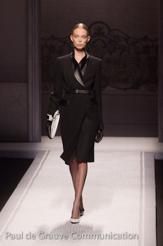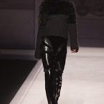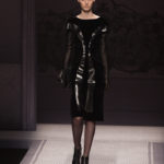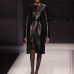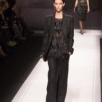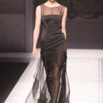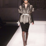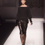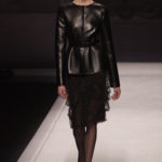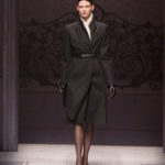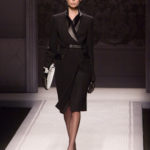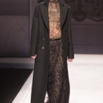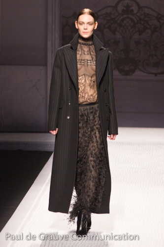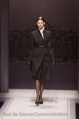 Porta con disinvoltura un lungo cappotto gessato, dai grandi revers, ma su una gonna iperfemminile con blusa trasparente; oppure un tailleur pantalone sempre gessato con un bluson corto nero ricamato di jais e piume. La scelta del gessato si moltiplica nel cappotto “da mattina” con cintura in vita e sorprendentemente in un abitino scivolato in chiffon. Gli stili sono mescolati anche attraverso i cappotti in pelle costruiti con tagli ed inserti che conferiscono al capo un’aria squadrata, decisa, ammorbidita dagli abiti trasparenti che talvolta solo si intravvedono.