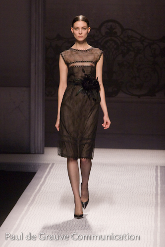 Tra gli accessori le scarpe sono con tacco a spillo, décolleté o tronchetti che si intravedono anche su abiti lunghi in chiffon. Due elementi da sottolineare: la presenza delle calze nere trasparenti -non più quindi coprenti- e la calza scura portata con scarpe chiare, una licenza stilistica che Alberta Ferretti può permettersi e che potrebbe segnare il cambio di un codice sedimentato. Le borse di grandezza media, piatte, con tracolle di catene metalliche.