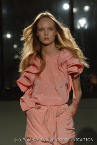 All’esuberanza degli abiti si contrappone la compostezza dei colori: predominano le tinte neutre del beige, sabbia e navy. Negli impalpabili dress in chiffon, invece, irrompono tonalità dai tocchi più acidi, come il giallo, il verde e il rosa.