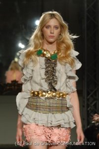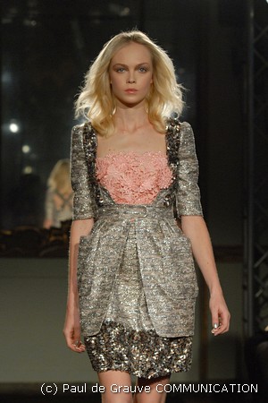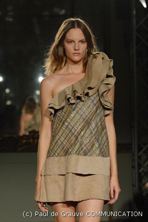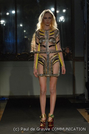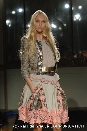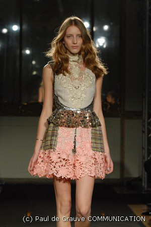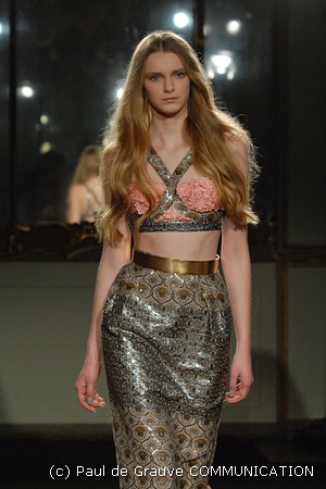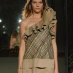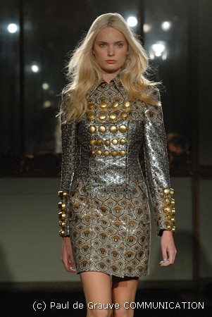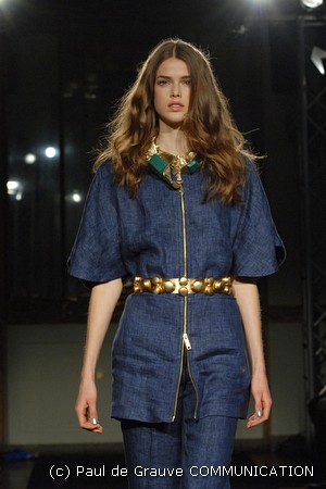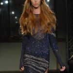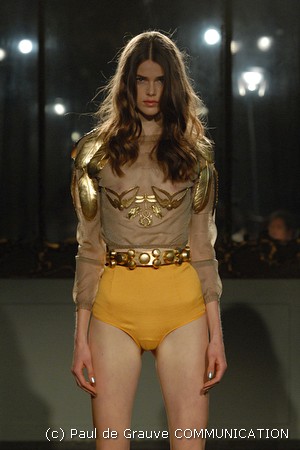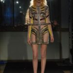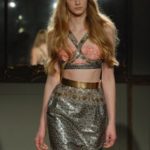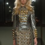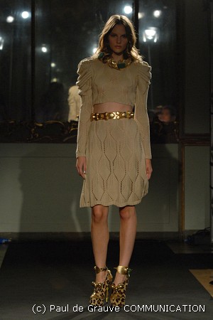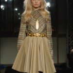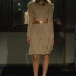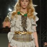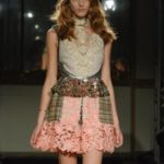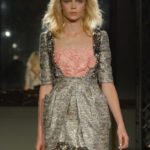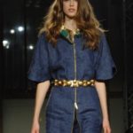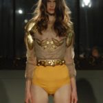 Tra micro pull, che si portano su ampie gonne a ruota, e maxi abiti traforati con applicazioni crochet, non poteva mancare la reinterpretazione in versione mini dress – intarsiato con fili di cuoio scamosciato – del bustier Christy, lo stesso che indossò Chirsty Turlinghton nel ’92 (su quella passerella sfilarono tutte insieme le top del momento: Claudia Schiffer, Linda Evangelista, Naomi Campbell e Carla Bruni). Tanto pizzo e intrecci di fili in lurex, ma anche abiti e gonne plissettate dal gusto un po’ retrò. Il tubino è in versione denim con la zip dorata che attraversa la silhouette di sbieco.