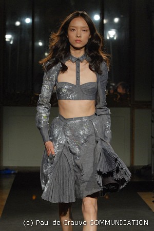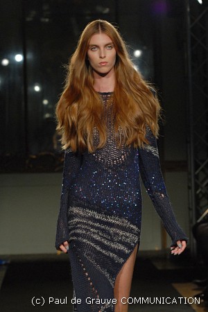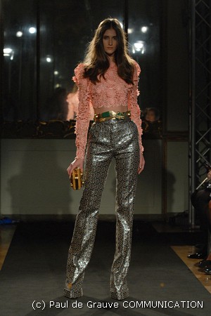 Dello stesso capo c’è anche una declinazione, senz’altro più artistica che prèt a porter, in tulle aderente ricamato a mano con applicazioni di catene argentate e fili di seta. Il tessuto è completamente trasparente e gli intarsi sembrano quasi fatti direttamente sulla silhouette. I pantaloni sono a vita alta e d’ispirazione seventies oppure, come tute, stretti al fondo.