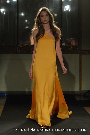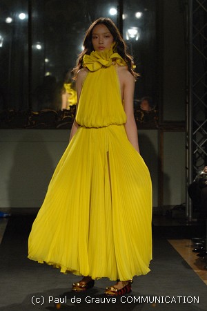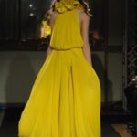 Anche la sera è glamour, ma più romantica. Sembra preso in prestito da madre natura l’abito lungo, di un giallo acceso e con plissettature che sbocciano anche sul collo e proseguono giù per la schiena, segnando la linea della scollatura; il disegno, molto particolare, ricorda un fiore pronto a dischiudersi.