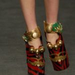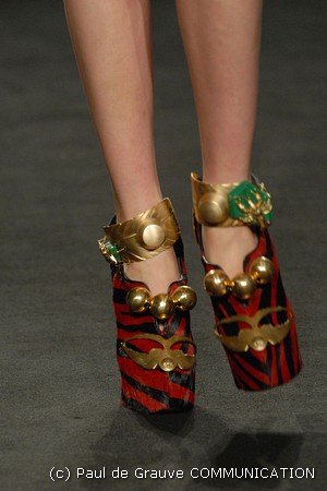 Con il linguaggio surreale che ormai lo caratterizza, Navarra, comunica uno stile decisamente urbano, che si esprime soprattutto nei dettagli e negli accessori. La cintura è gold e rigorosamente metallica. Così come le borchie, i fiori e le foglie, applicate sulle scarpe: zeppe vertiginose o ballerine, stampate a motivo animalier, beige o rosse.