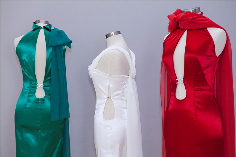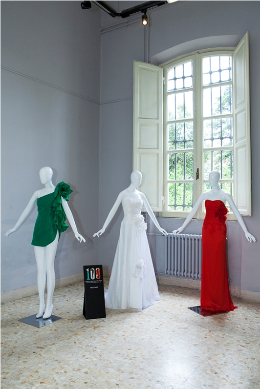 Egon von Furstenberg ha collocato la sua bandiera –un cordoncino bianco rosso verde- sul rever dello smoking rigorosamente “bianco”, simbolo quindi di un messaggio di tregua e pace; Bertoletti 1882 Pelliccerie ha interpretato in modo creativo lo spirito del progetto “100” esprimendolo sia attraverso il colore sia inserendo nei suoi tre outfits immagini iconiche della propria storia. La stilista Eleonora Giamberduca con la sua linea Elins Moda -ci racconta l’impatto e la trepidazione per rispondere ad una richiesta tanto precisa e vincolante- ha voluto comunicare nei colori intensi dei suoi abiti tricolore, passione, stile ed eleganza ed ha voluto riservare il verde ad un outfit maschile. Le tre creazioni delle Gemelle Donato si sono ispirate alle opere del grande maestro “Roberto Capucci”, vere e proprie sculture. La Maison La Via della Seta di Francesca Paternò ha ideato e realizzato i tre capi d’alta moda interamente a mano, in ossequio alla più illustre tradizione sartoriale italiana, realizzandoli con materiali di pregio e ricami artigianali. Per Mariano La Barbera una ispirazione classica: nelle sue tre “Grazie” gli abiti si aggrappano al corpo per ottenere il concetto dinamico del torchon a rulè delle bandiere militare. Mauro Gala con materiali raffinati, trame di jacquard, chiffon, organza e satin, ci porta indietro all’inizio del ‘900, agli albori del secolo d’oro della moda, al lusso della Bella Epoque e degli abiti di Poiret, quindi prima che la Grande Guerra cambiasse il volto geografico e sociale dell’Europa.