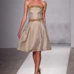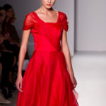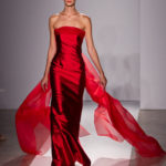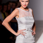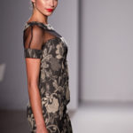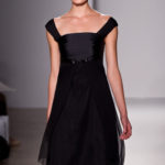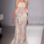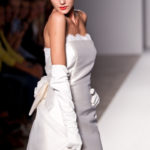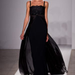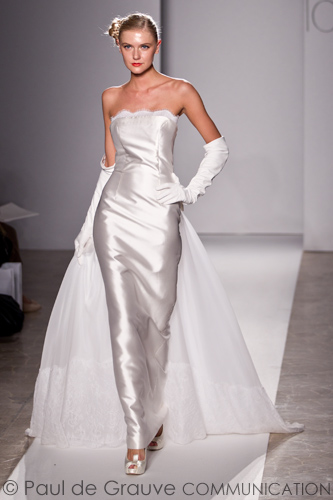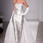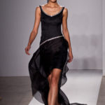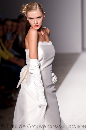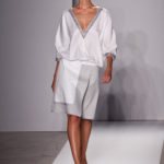 La collezione chiude come è tradizione con l’abito da sposa semplicissimo nella linea, ma impreziosito da uno strascico con una lata balza di pizzo leggerissimo.