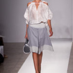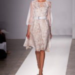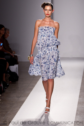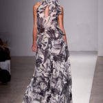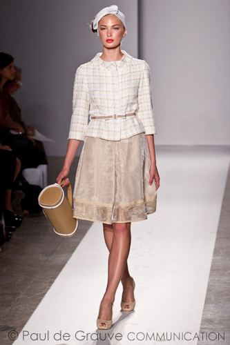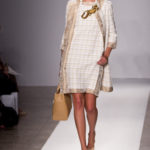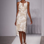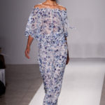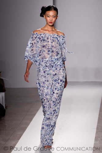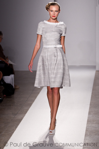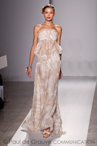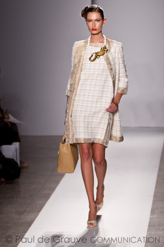 Lo stilista attinge a tre fonti di ispirazione, il viaggio, l’oriente e gli anni ’60. Ne viene fuori una collezione a doppio registro. Abiti strutturati dalle linee dritte e squadrate, in tessuti sostenuti per i soprabiti, le giacche e gli abitini e le gonne in bouclé di cotone, o in piquet di cotone di chiara ispirazione anni ’60. E poi gli abiti caftano in chiffon sfumati, talora plissettati e gli abiti da cocktail in chiffon goffrato e gli abiti da sera in mikado e organza, leggeri e svolazzanti, per una visione più morbida della silhouette femminile.