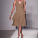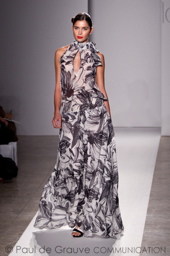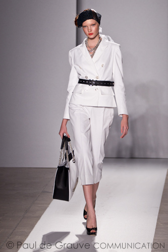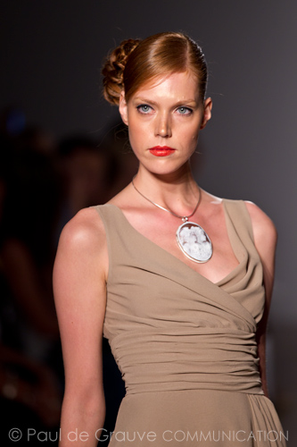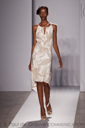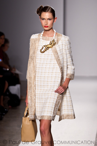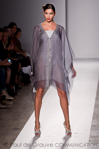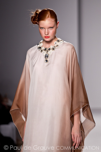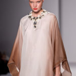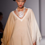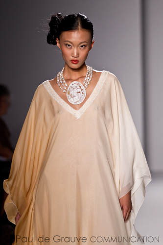 Da evidenziare. Lo spolverino in organza sull’abito stampato a fiori in bianco/beige; le camicie in georgette chiuse da cordoni; il mini dress bianco scolatura a barchetta fermata da un nodo. Le scollature dei caftani ricamate in pietre e jais un tocco di moda che non appesantisce il capo. Gli accessori, collane importanti di sapor orientale, perle bianche chiuse da un drago per arricchire l’estrema semplicità dell’abito e spolverino bianco beige, grande cammeo sull’abito da cocktail color tabacco, sui caftani sfumati beige, semplicissime ed elegantissime perle trasparenti.