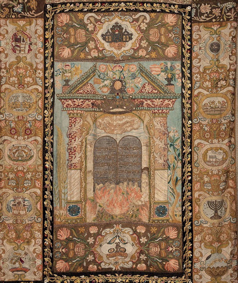 I ricami raggiungono vette di virtuosismo, alcuni con ‘stemmi parlanti’ (gli Ebrei non potevano ricevere un titolo nobiliare) entro fastose cornici barocche. Vere e proprie “pitture ad ago” che brillavano alle luci mobili delle candele e delle torce, in un trionfo di sete colorate, di fili d’oro e d’argento, sono opera delle abili mani delle donne che, pur rinchiuse tra le mura domestiche, hanno saputo esprimere una notevole inventiva e vastità di conoscenze.