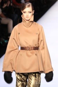 Altre volte è senza abbottonatura sovrapposto e fermato in vita da cintura in pelle. Max Mara interpreta il suo capo must in materiali diversi nel classico cammello, in velluto millerighe, o in montone rovesciato, in cachemire. Lo arricchisce di colli alti e di cappucci importanti che buttati sulle spalle fanno da ulteriore coprispalla.