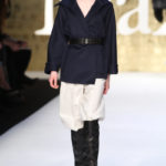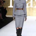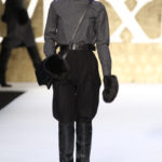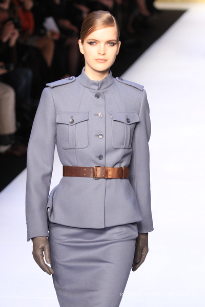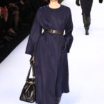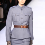 La collezione si snoda poi con i tailleur: giacche, per accompagnare gonne o pantaloni, dal sapore militare chiuse in vita da cinture che portano dietro due borsine, con mostrine o una fila di bottoni metallici per sottolineare le spalle. Ma le cinture ci riservano una piccola sorpresa. Ecco che sul cappotto lungo a vita bassa appare la tipica cintura a pieghe da smoking, che si ripresenta su un tailleur pantalone nero, uno smoking appunto, ma a chiudere la giacca.