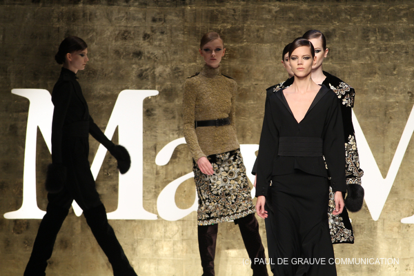 I tessuti sono quelli classici di Max Mara: cashemere, cammello, flanella, panno, a cui si aggiungono i velluti a coste grandi, ma anche il raso in stampa foca o il lamè.