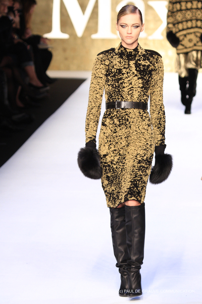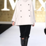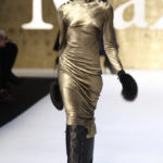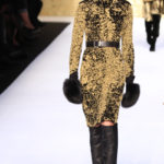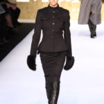 La gonna è lunga e dal leggero sapore ottocentesco per le arricciature su un lato o dietro e sempre con orlo asimmetrico lì dove c’è l’arricciatura. Anche gli abiti sono chiusi da doppia abbottonatura di metallo, spalline da cadetto e collo alla coreana o con ampi revers che enfatizzano la scollatura. Il tricot costruisce cappottini spesso doppiopetto sempre con bottoni metallici, o lunghi pull dal collo alto da portare su gonne di lamè. Il lurex e l’oro sono smorzati da dettagli molto sportivi, giacca marrone in flanella, o cinture di cuoio per l’abito scivolato. Dopo il rigore dei capi tradizionali per contrasto si fanno notare, anche se il risultato è troppo pesante e ricercato, l’abito robe-manteau in velluto nero, riccamente ricamato in oro e impreziosito da strass colorati, chiuso da cintura nera e la gonna con lo stesso ricamo portata con un pull di velluto oro.