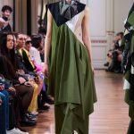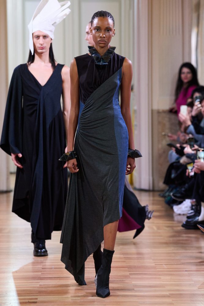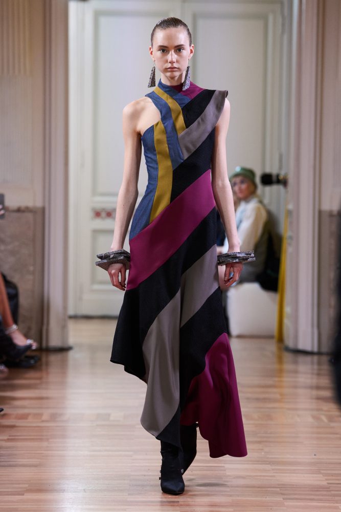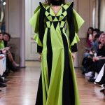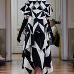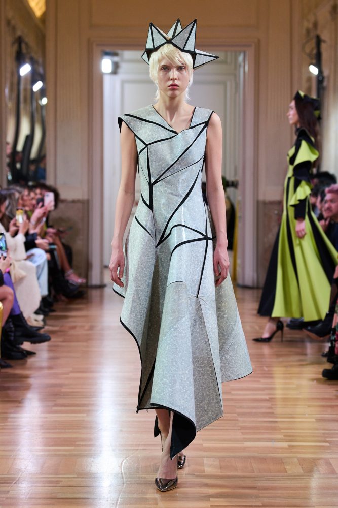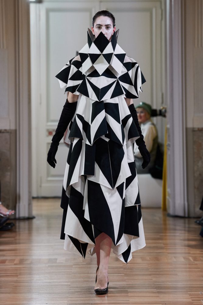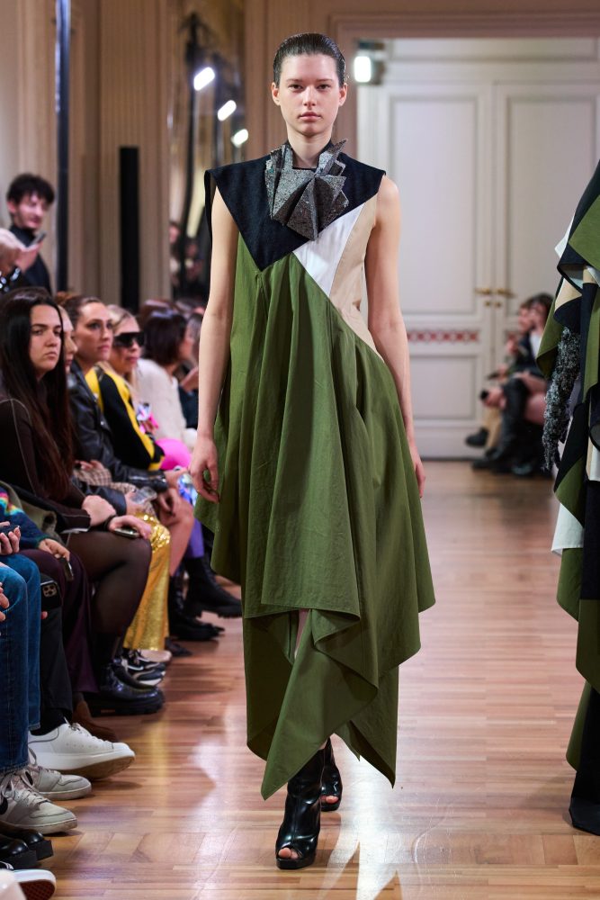 A parte queste considerazioni che sono alla base del lavoro dello stilista giapponese, la collezione richiama l’attenzione per il design e per l’accostamento dei colori. L’impressione fondamentale è che lo stilista si sia divertito a fare origami con i materiali che aveva a disposizione: ogni abito è un gioco di sovrapposizioni a partire dalla prima uscita dove la perfetta geometria dei triangoli di stoffa – color block verde, nero, bianco- costruisce l’abito che copre anche il viso della modella. L’impatto della visione del primo abito porta a chiedersi perché lo stilista lo ha posto all’inizio della sua performance. A noi è parso di scorgervi un richiamo alla responsabilità in questo caso ecologica: come dire, non chiudiamo gli occhi davanti al problema che lo smaltimento dei rifiuti anche nella moda provoca; non chiudiamoci dentro i nostri personali problemi quando i problemi dell’umanità richiedono di aprire gli occhi per tentare di risolverli.