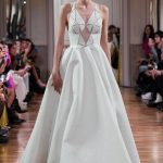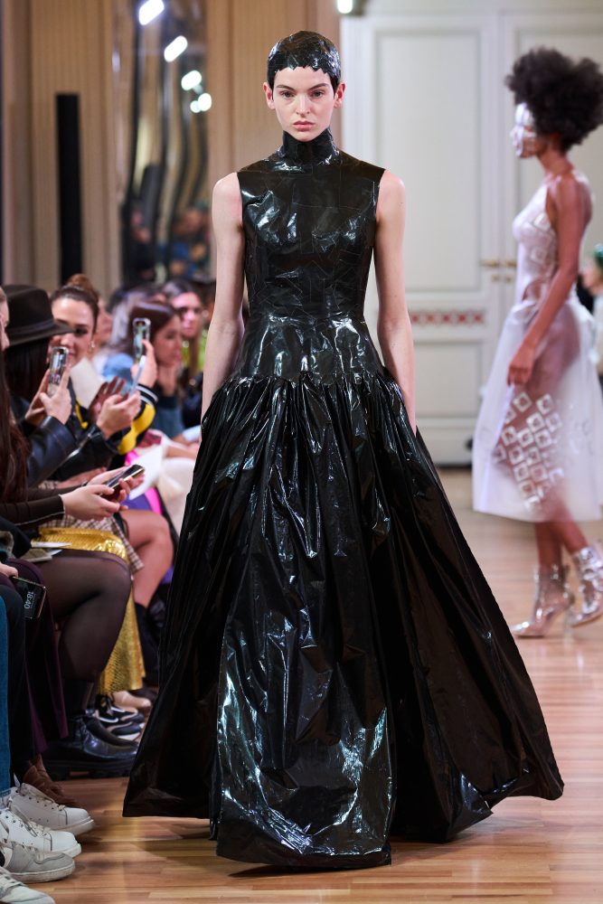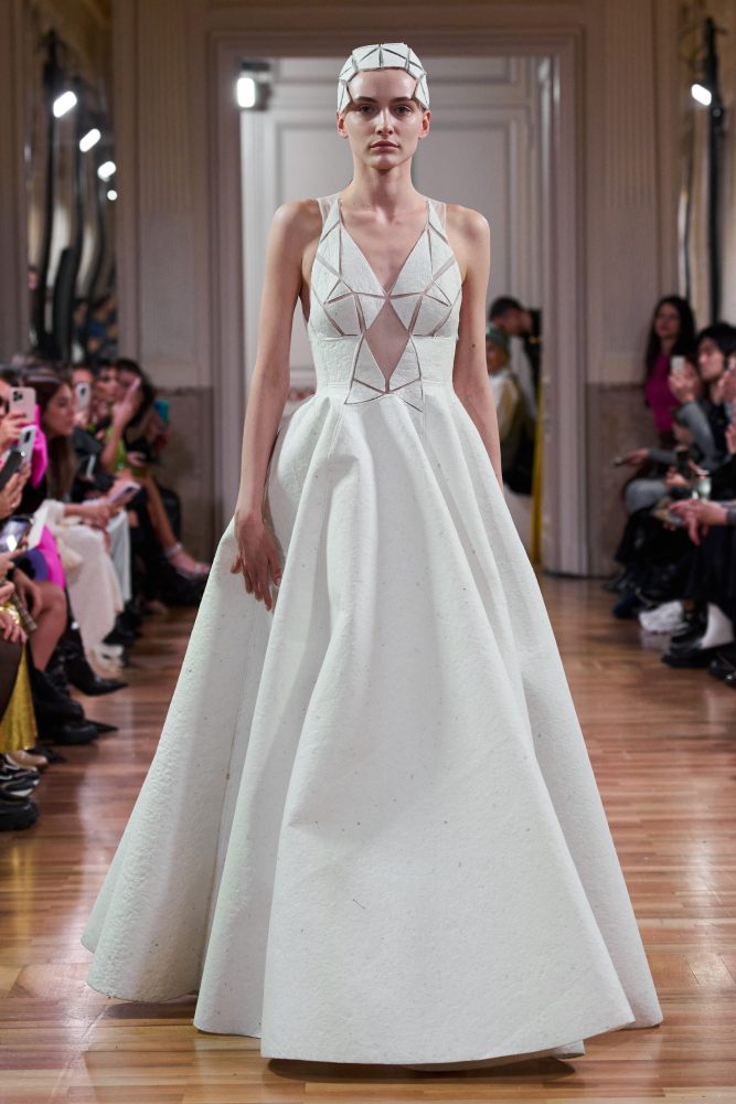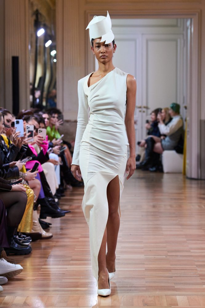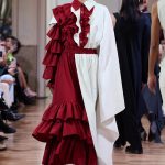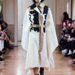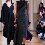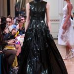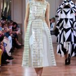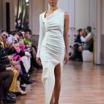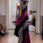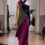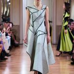 L’abbinamento cromatico del color block – due colori o più colori- impreziosisce i capi dalla linea aderente rendendoli eleganti e femminili. Tra gli abiti più sorprendenti ci sono sembrati: il completo bianco gonna e corpetto ottenuti da due piramidi tronche rovesciate senza aggiungere altro, né una pince né un bottone. Per il lavoro che deve aver comportato abbiamo ammirato ancora un abito bianco dalla linea pulita, ottenuta nonostante il volume che raggiunge grazie alla lavorazione del tessuto. Potremmo nominare ancore gli altri abiti bianchi, l’abito nero lucido o l’abito doppiato con piastrine che ha riportato la memoria alle creazioni di Paco Rabanne.