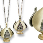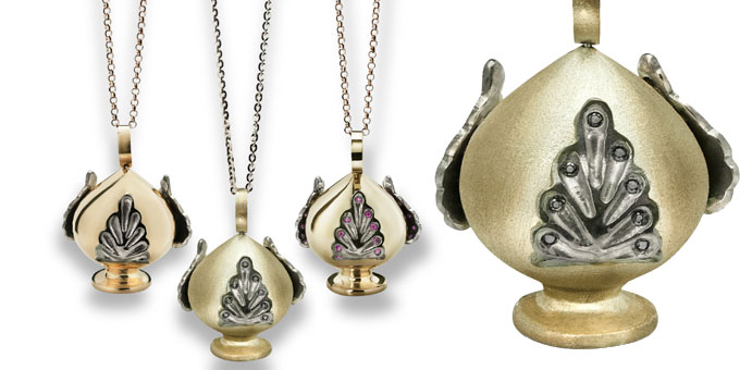Il “suo” PUMO -sempre offerto come pezzo unico ed esclusivo-, “tradotto” in argento o in oro e rifinito con pietre preziose che ornano le tipiche foglie di acanto che racchiudono il bocciolo, diventa un ciondolo al centro di una catena o parte di una collana trasformabile a piacimento, da indossare vicino al cuore. E si presta a mutarsi in un pendente per le orecchie, da indossare vicino al pensiero……