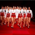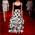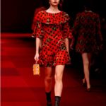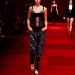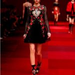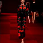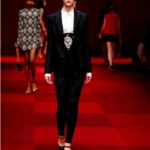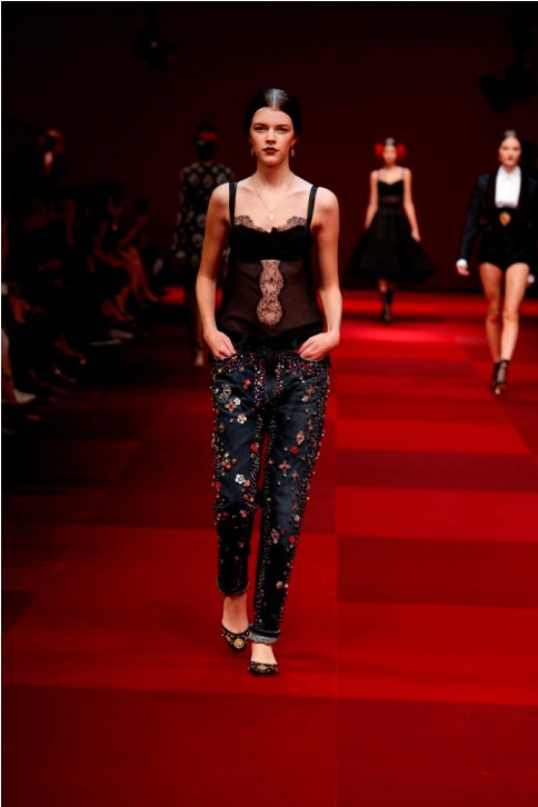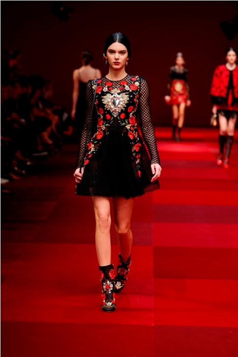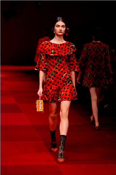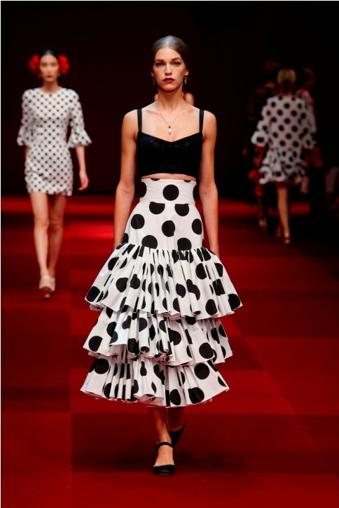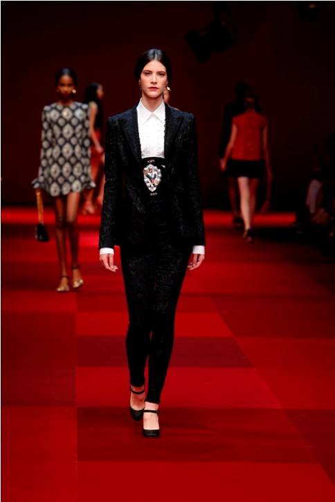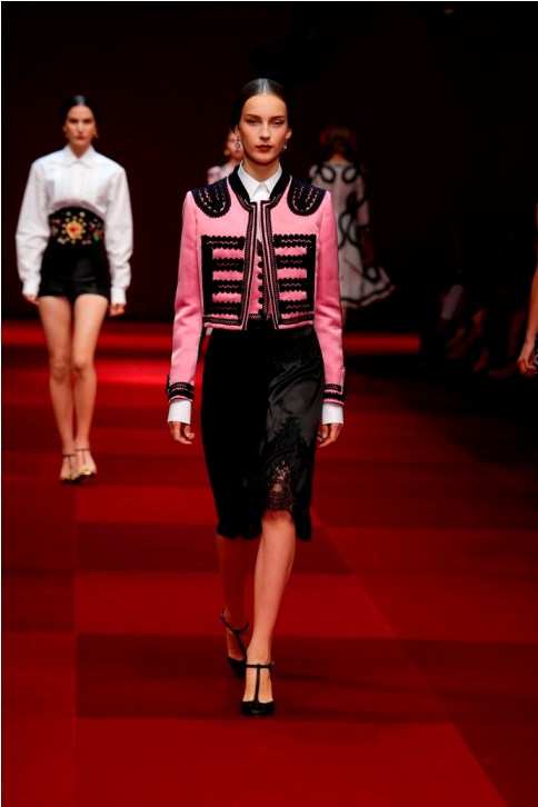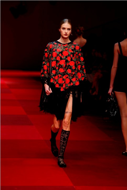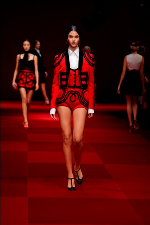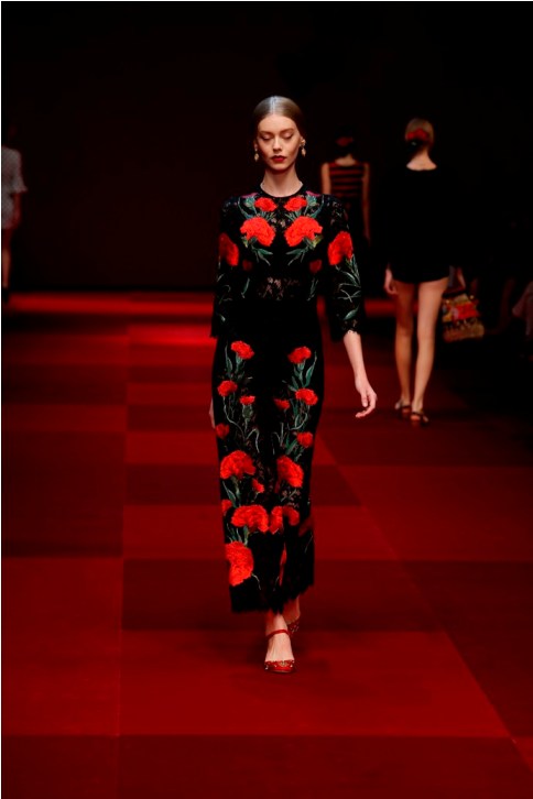 Claveles rojos appuntati sui capelli tra l’orecchio e la nuca, stampati su abiti neri, ricamati su scialli; trajes de lunares ricchi di balze, per ballare las sevillanas o per andare a cavallo durante il pellegrinaggio a la Virgen del Rocìo o per ricevere gli amici en las casetas de la la feria e offrire loro un bicchiere de manzanilla, perché il vino è necessario per favorire che entre el duende e iniziare a ballare; trajes de luces bordados dei toreri; il tradizionale; ricco pizzo nero o bianco delle mantillas è utilizzato per gli abiti trasparenti ed erotici; rojo, negro; mantón de Manila; capelli raccolti con raya en el medio; cante toque baile. Ci sono quasi tutte le suggestioni dell’Andalusia nella collezione donna Dolce&Gabbana 2015– mancano las mantillas con sus pinetas, , le chitarre e las castañuelas e non osiamo nominare los pasos delle processioni de la Semana Santa perché temiamo che i nostri potrebbero stampare la Macarena o il Cristo del gran Poder sulle banali t-shirt. Ne avevamo avuto un assaggio a luglio nella collezione uomo che, precedendo la donna parrebbe essere utilizzata come pietra di paragone – per vedere l’effetto che fa-, come vengono accolte le scelte stilistiche del duo più famoso del mondo o semplicemente per un principio di pari opportunità. Quindi ci aspettavamo questa performans.