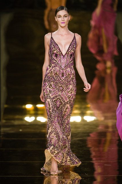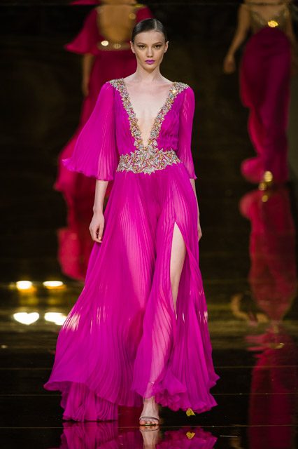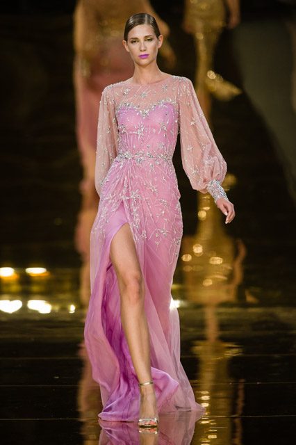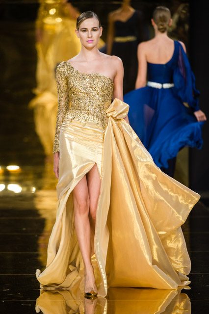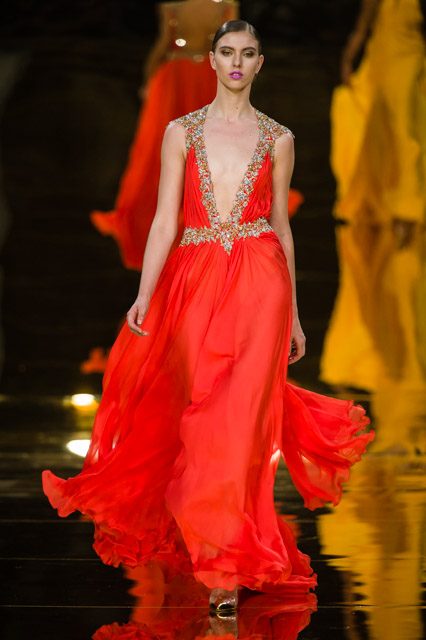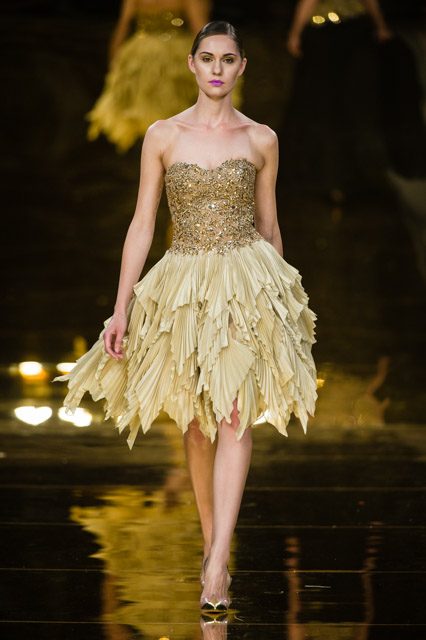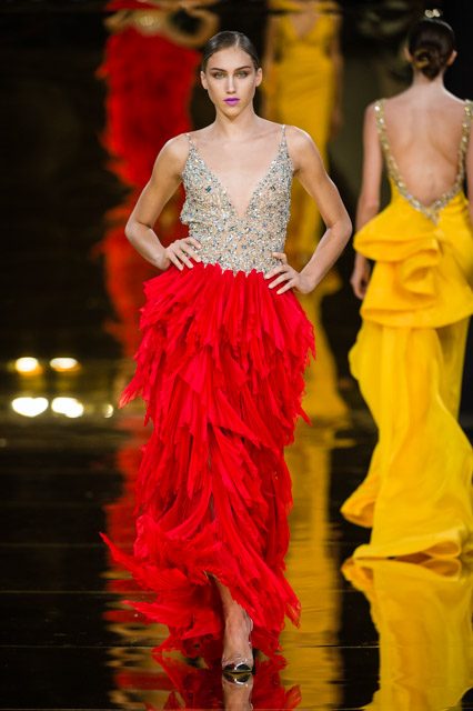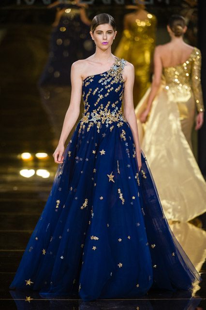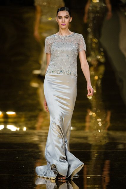 E’ cosi che, nell’ultima edizione di Altaroma, Rany Zakhem irrompe nella scena del party: con scrosci di stelle cadenti su abiti opulenti trasformate in iridescenti filamenti luminosi; una serie ordinata di bagliori posati, come farfalle aleggianti, su silhouette da mille e una notte. Scollature dai tagli impeccabili, fluidità di forme e impalpabilità di tessuti atti a disegnare effetti armonici di grande fascino; leggiadrie da étoilé.
