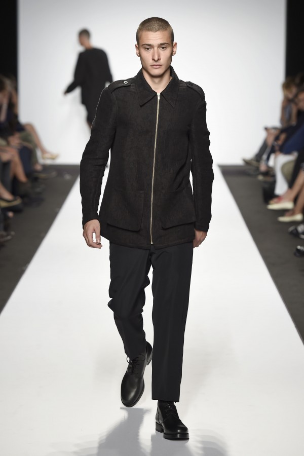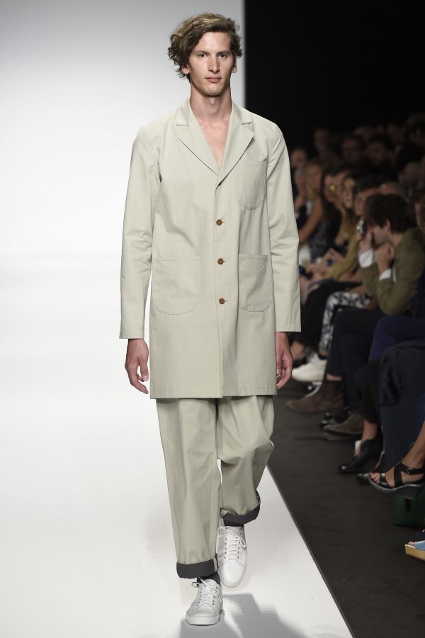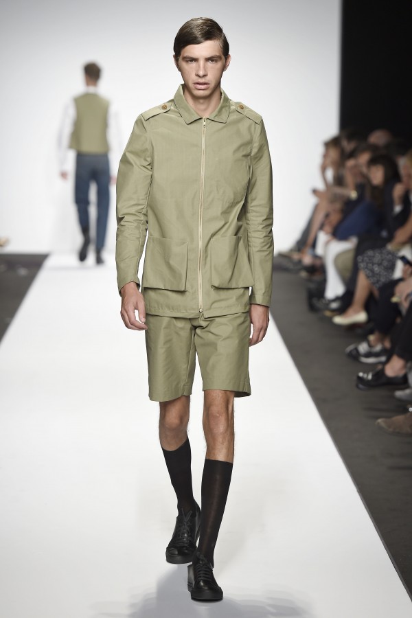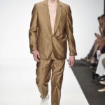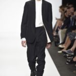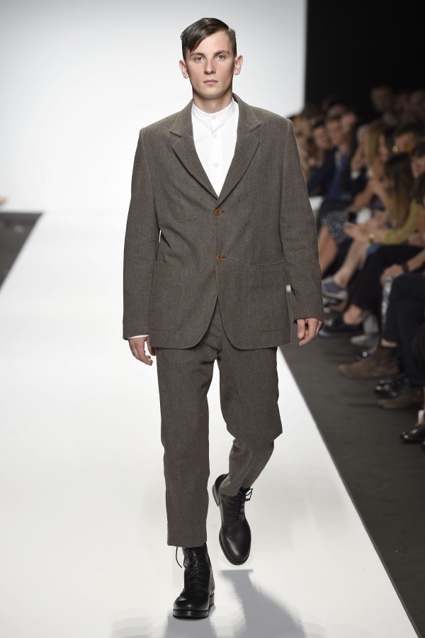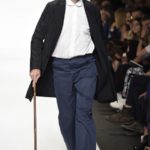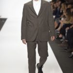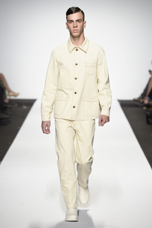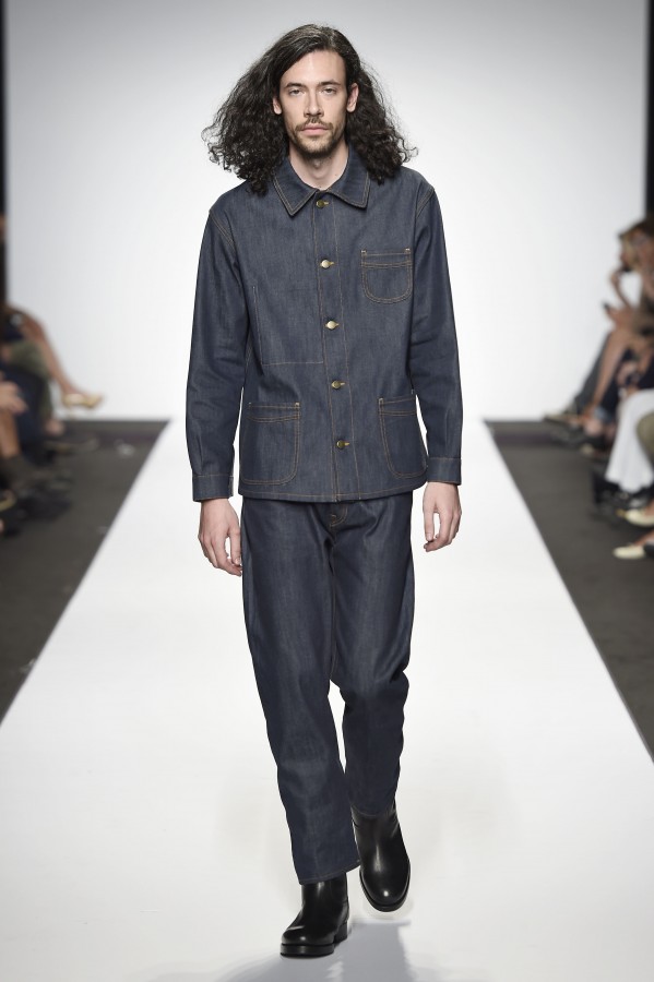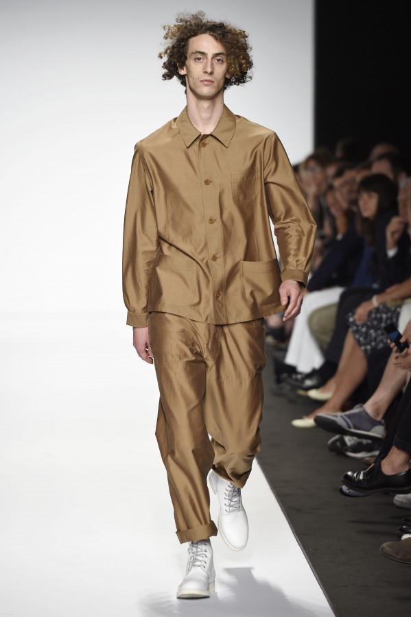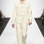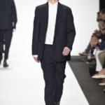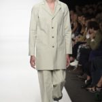 Veniamo alla collezione che ha spunti interessanti, anche se la sensazione definitiva è di ripetitività; ma è una nota negativa che bisogna perdonare ai giovani che tendono a rassicurasi replicando ciò che reputano ben riuscito. Definiremmo la collezione modernamente classica, senza punti di stridenza, dove la nota distintiva è l’utilizzazione di contaminazioni da ambienti professionali di stampo operaio come i pantaloni ampi, le camicie che assumono proporzioni comode, le giacche caratterizzate da volumi e proporzioni rilassate, in contrasto quindi con la tendenza più attuali o classica, che dir si voglia, di rendere asciutta la silhouette. Altri piccoli elementi del mondo operaio: tasche quasi sempre applicate, grandi, comode quasi a dover contenere piccoli attrezzi da lavoro, sono esagerate sui gilet che vengono indossati sopra le giacche; uso del denim, ma per ottenere giacche e pantaloni di stile rigoroso.
