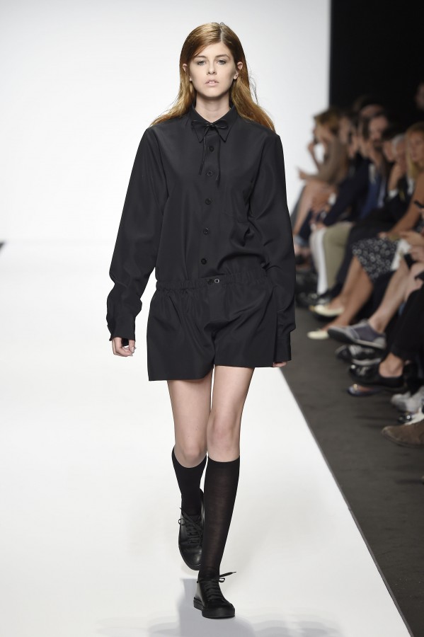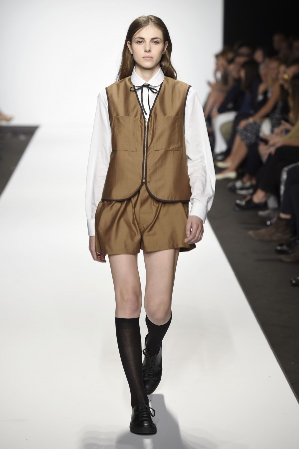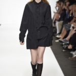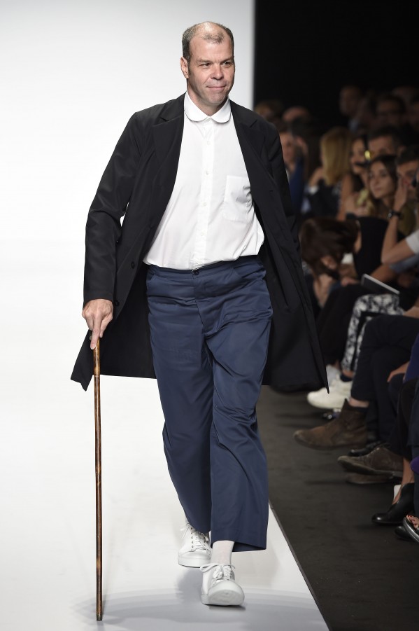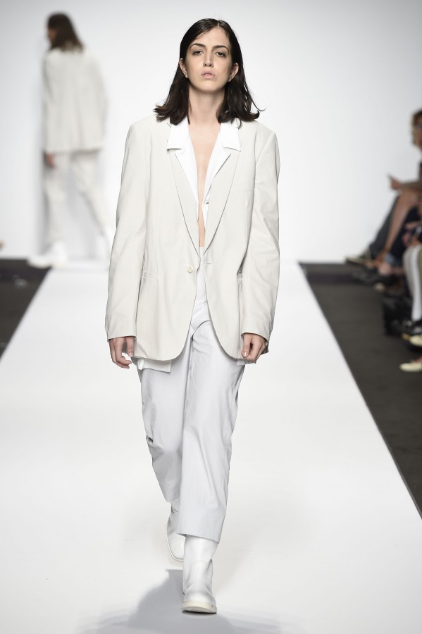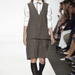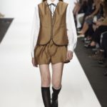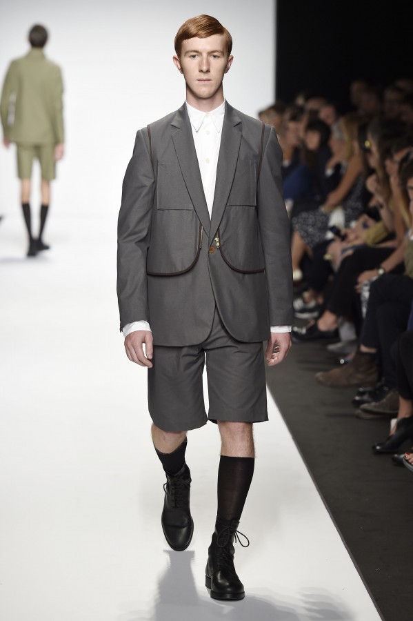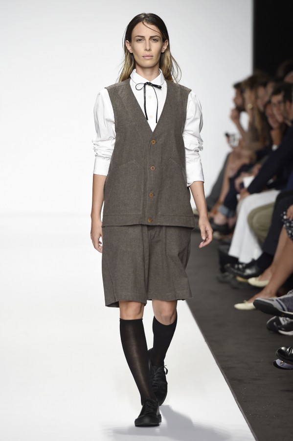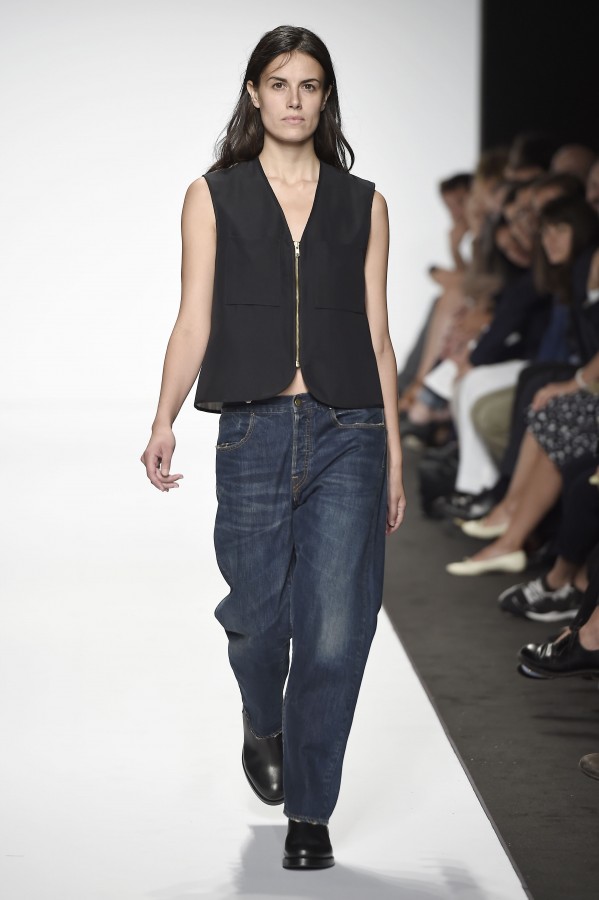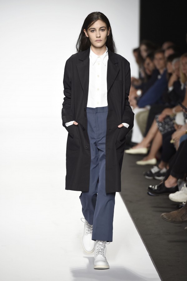 Veniamo alla collezione che ha spunti interessanti, anche se la sensazione definitiva è di ripetitività; ma è una nota negativa che bisogna perdonare ai giovani che tendono a rassicurasi replicando ciò che reputano ben riuscito. Definiremmo la collezione modernamente classica, senza punti di stridenza, dove la nota distintiva è l’utilizzazione di contaminazioni da ambienti professionali di stampo operaio come i pantaloni ampi, le camicie che assumono proporzioni comode, le giacche caratterizzate da volumi e proporzioni rilassate, in contrasto quindi con la tendenza più attuali o classica, che dir si voglia, di rendere asciutta la silhouette. Altri piccoli elementi del mondo operaio: tasche quasi sempre applicate, grandi, comode quasi a dover contenere piccoli attrezzi da lavoro, sono esagerate sui gilet che vengono indossati sopra le giacche; uso del denim, ma per ottenere giacche e pantaloni di stile rigoroso.