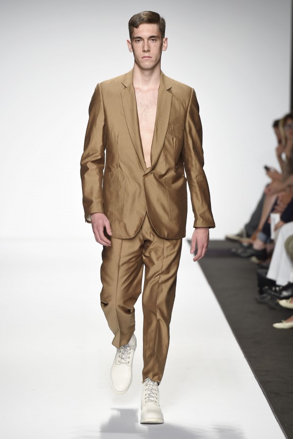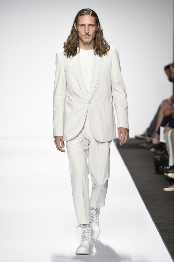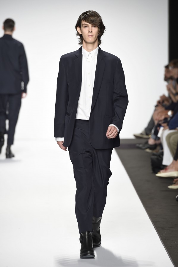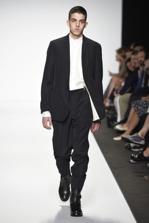 Prima di affrontare le osservazioni sulla collezione, una considerazione che vuole essere un suggerimento per le sfilate uomo. La sfilata è un po’ uno spettacolo composto da tanti elementi che contribuiscono al successo della collezione: location, musica, regia dell’evento ecc. Nella sfilata che stiamo considerando ciò che non ha convinto è stato l’atteggiamento dei modelli. Non pretendiamo che i ragazzi siano in grado di interpretare ciò che portano addosso: l’uomo non ha necessità di atteggiare il corpo, il viso, lo sguardo a ciò che indossano. Ma un minimo di partecipazione da parte dei modelli sarebbe auspicabile: l’aria assente , se non “seccata”, nuoce all’insieme dello spettacolo, annoia chi guarda, che distoglie lo sguardo dalla passerella.