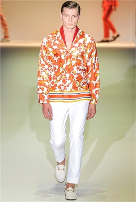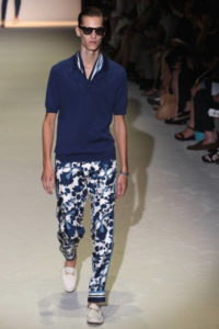 La collezione di Gucci propone tinte “da urlo”, fantasie di fiori a profusione, capi svelti da lupi di mare, mocassini col morsetto e sacche a righe carioca, ma anche vestiti a tre pezzi filanti a matita per maschi del jet-set davvero chic. Anche Zegna e Cavalli mutuano la loro tavolozza dalla natura al risveglio e dall’arte contemporanea, riuscendo a coniugare con classe perizia sartoriale e voglia di casual, in un tripudio di tessuti fluidamente serici. In particolare Roberto Cavalli ribadisce il suo machismo opulento, ipnotico e fascinoso, fatto di meraviglie artigianali e suggestioni carpite al surrealismo.