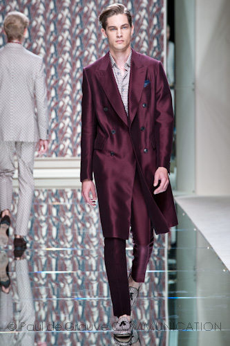 Fendi torna al futuro con raffinati accessori pensati per computer e Ipad, ma soprattutto con capi che, pur richiamando tagli e colori d’altri tempi, mirano a uomini-rockstar del presente che prediligono casacche in anguilla optical, spolverini di pitone, tessuti metallici ed acrilici che riflettono la luce come lune vaganti, scarpe con suole trasparenti.
