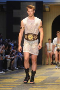 Così, se Dolce&Gabbana fanno sfilare il macho siciliano purosangue con i calzoni a vita alta (era ora!), le bluse stampate di pupi e le squisite scarpe intrecciate che piacerebbero al Principe di Salina, Donatella Versace lancia in passerella uomini “duri”, muscolosi, che ostentano braccia nerborute all’esterno di giacche senza maniche. “Lady Blonde” conferma il mood atletico anche nelle calzature – sneaker alte – e nei pantaloni, che si riducono a boxer da pugile.