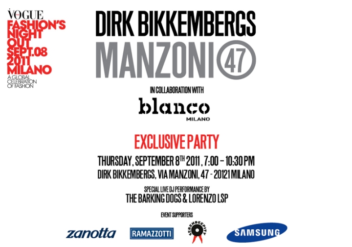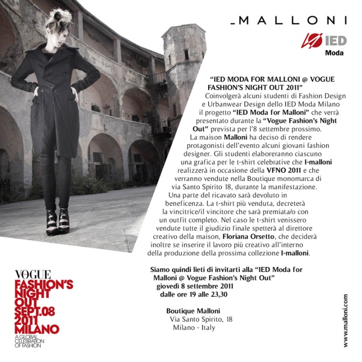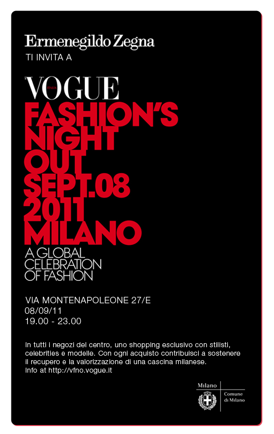 Dieci negozi Ermenegildo Zegna, nelle città di Milano, New York, Londra, Los Angeles,Berlino, Dusseldorf, Mosca, Lisbona, Shanghai e Atene parteciperannono alla Vogue Fashion’s Night Out. Per l’occasione vengono proposte due borse in due formati differenti, la Tote Bag e la Flat Bag, in seta bordeaux con stampa puntinè, dettagli in pelle e logo del ventennale. L’intero ricavato della vendita della Tote e della Flat Bag, verrà devoluto al progetto del Comune di Milano per finanziare l’intervento di recupero e valorizzazione di una cascina milanese.