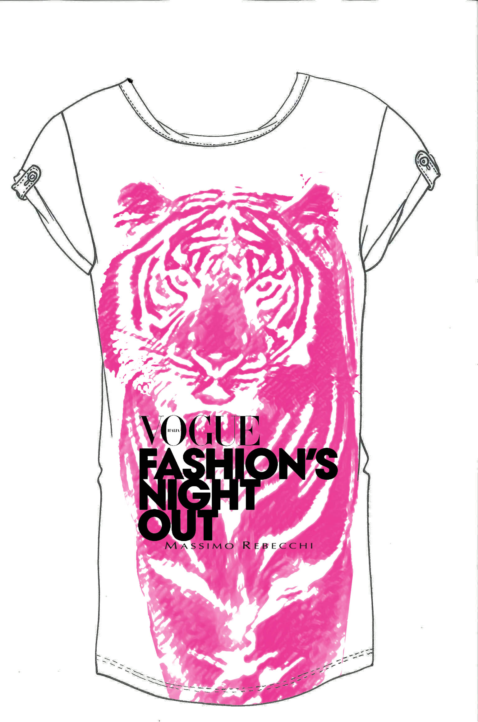 Massimo Rebecchi ha creato una speciale t-shirt che sarà messa in vendita solo per le notti della Vogue Fashion’s Night Out di Milano e di Firenze. La maglia, in elegante total white, è realizzata in morbido cotone ed è impreziosita dal profilo rosa fluo di una tigre, con il logo della Vogue Fashion Night Out e la firma di Massimo Rebecchi, of course! L’intero ricavato della vendita della t-shirt sarà infatti devoluto a sostenere la ricostruzione delle zone terremotate dell’Emilia.