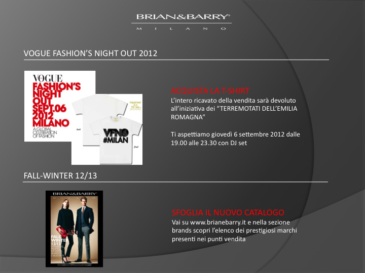 Brian&Barry ha realizzato con “Happiness is a $10 Tee” una T-shirt in esclusiva che verrà messa in vendita durante la serata. Il ricavato sarà totalmente devoluto in beneficenza a sostegno dei “terremotati dell’Emilia”. In occasione dell’evento verrà presentato il nuovo catalogo con le proposte Autunno-Inverno 2012.
